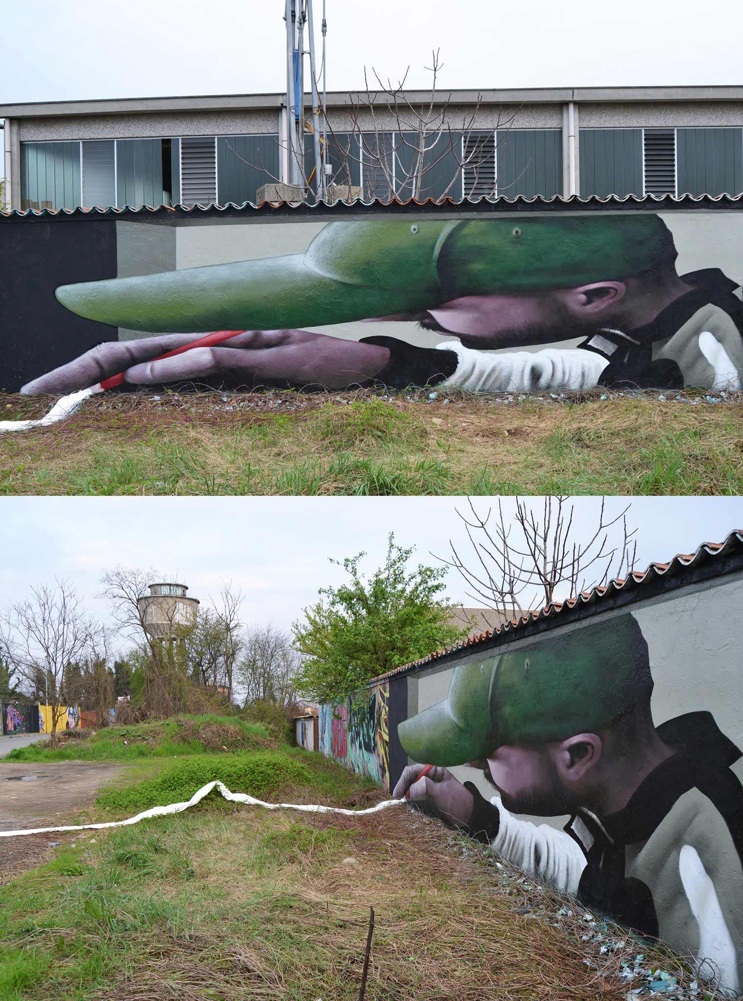 Caiffa Cosimo weiß nicht nicht, wie man wohl-schattiert und perspektivisch korrekt realistisch anmutende Motive an die Wände bringt, sondern auch, über diese Wände hinaus zu denken. Er setzt die unmittelbare Umgebung mit ein. Mal direkter, mal indirekter. Gerne auch im Zusammenspiel mit der Perspektive, so dürften einige seiner Umsetzung nur von einem bestimmten Standpunkt aus wirkliche Entfaltung finden. Von „sehr kreativ“ bis „einfach genial“ ist vieles in seinem Online-Portfolio zu finden – hier eine Auswahl der meiner Meinung nach besten Umsetzungen von ihm.