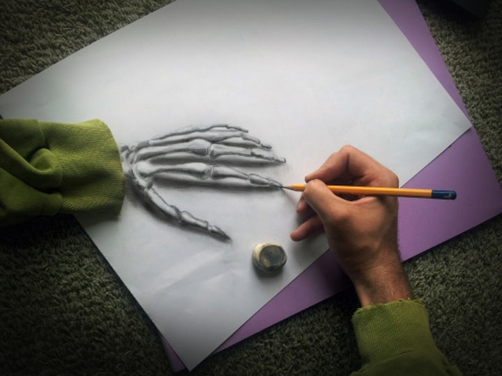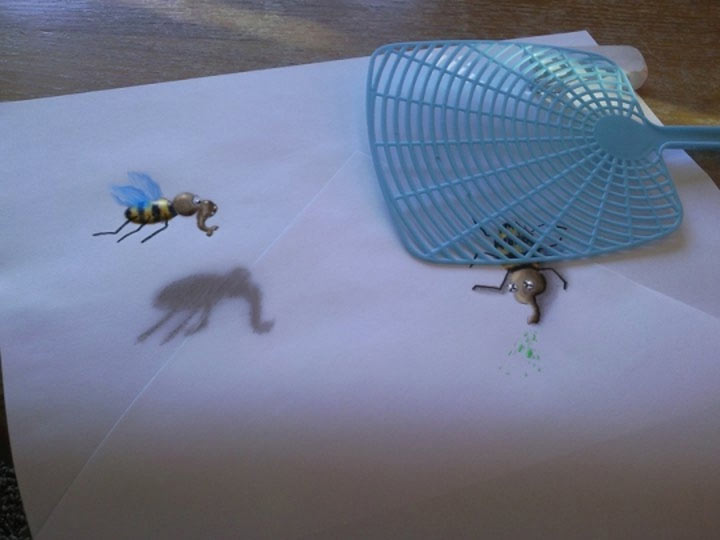 Ich mag es ja sehr, wenn man aus limitierten Medien und Flächen immer wieder Neues raus holt. Genau das macht Ramon Bruin mit seinen dreidimensionalen Zeichnungen. Die sind nicht nur perspektivisch gezeichnet und passend schattiert, nein, sie interagieren auch mit ihrer Umwelt.