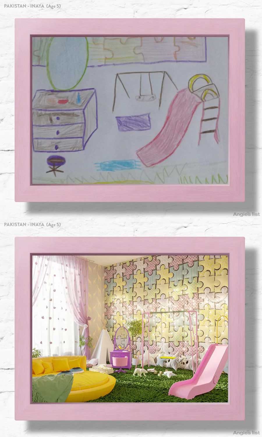 „Inaya loves nature and outdoor activities, as you can see from her drawing she has added flowers to the bed sheet, grass around her bed, and a swing/slide close to the bed. Inaya has filled her room with oval shapes. The bed, pillows, and mirror are all oval shaped which gives her room a very welcoming feeling. She also loves puzzles and designed the walls to be made up of jigsaw pieces. When Inaya saw her design brought to life she thought it was real and wanted to know when she could go and sit in the room.“