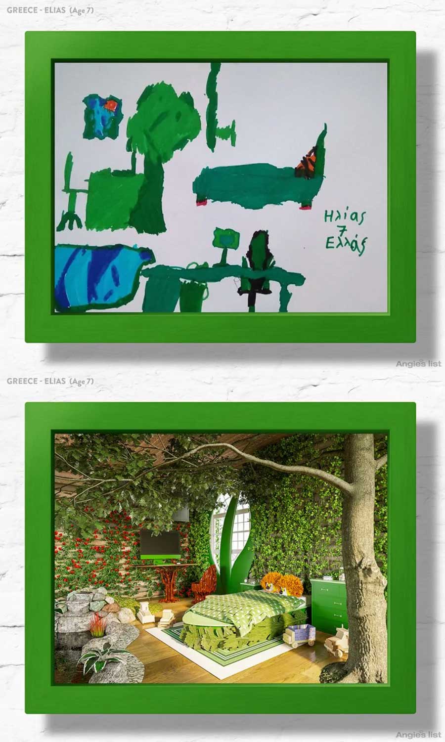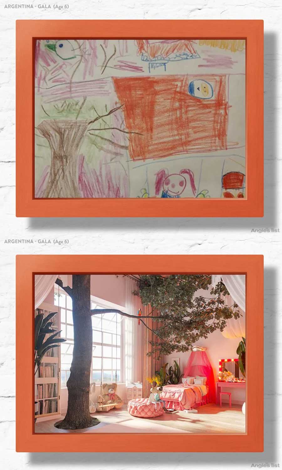 „The centerpiece of Gala’s dream room design is the big tree. According to Gala, inside the tree lives a parrot, who is free to fly in and out of the window anytime. There are two swings hanging from a branch of the tree, one is for Gala and the other is for her little brother Isidro. Other key elements of her design are the big mirror with lights, a bookcase full of books and real flowers. ‚Wooow!! What? I love it!‘ was Gala‘s response when she saw her room brought to life. She was ecstatic and hopes to save up enough money to get the room for real one day.“