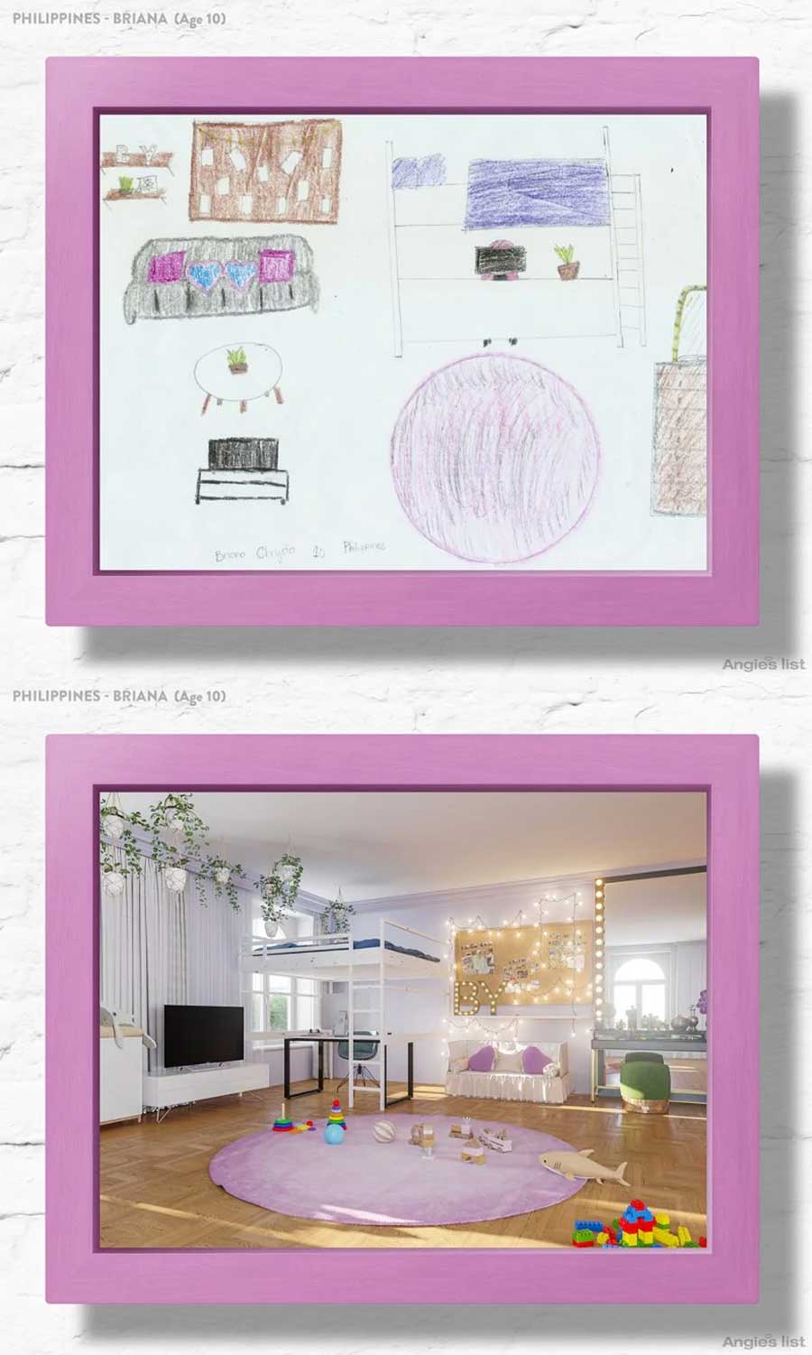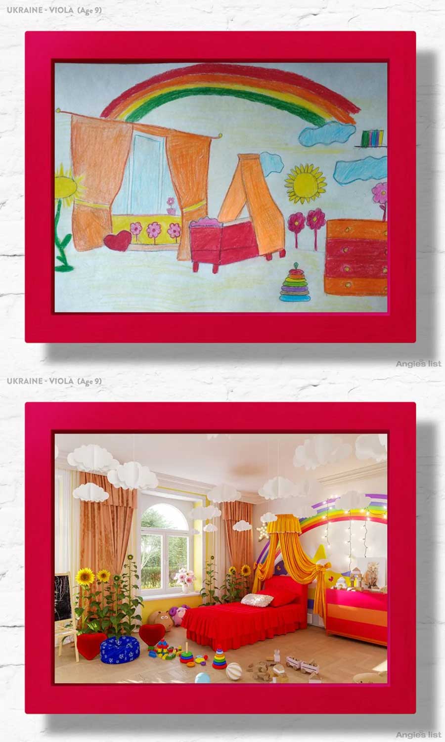 „Viola really loves cyan and violet colours. She says that violet is ‘the color of magic’. As you can see from her drawing, she also loves the sky and waterfalls. Viola’s dream room design is beautifully simple and elegant. She wanted to create a room which would come alive, a place where she can travel around and interact with all the things inside. She designed a big rainbow on the wall and hanging clouds to make if feel like sleeping in the sky. Imagine going to sleep here every night, your dreams would be fantastic. Upon seeing her room brought to life, Voila said she felt ‚happiness, bright colors, a warm summer, and sunny fun‘.“