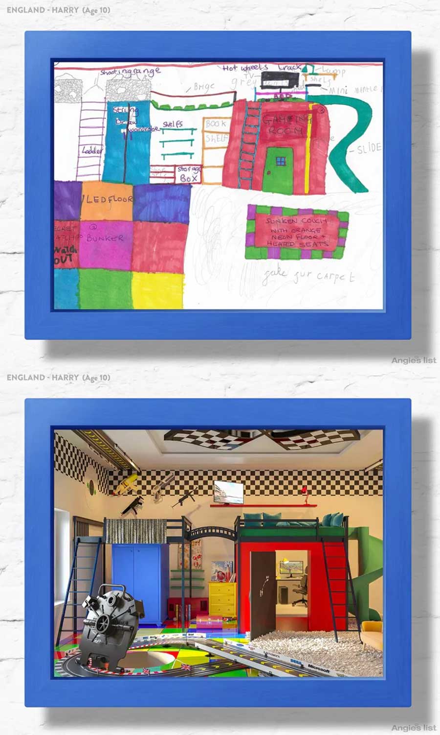 „Harry’s big dream is to become a SWAT police officer or racing car driver when he grows up. His room design is the perfect training ground and as you can see, it has been drawn with the finest attention to detail. It has an LED floor and a hot wheels track that circles the room. He designed a purple and green sunken couch with heated seats and a platform bed which connects to another platform via a wooden bridge. The bed is accessed by a ladder and of course you get down on a slide. Underneath the bed platform is a gaming room. Harry loved his room when he saw it and said it was exactly what he had drawn. He said he would love to have this bedroom for real.“