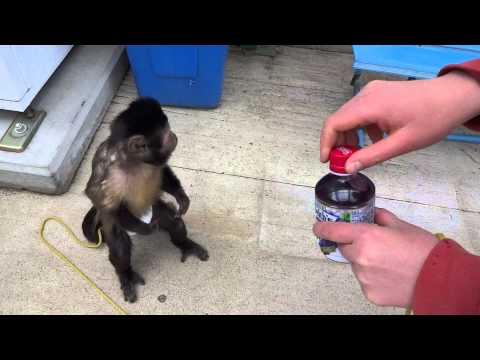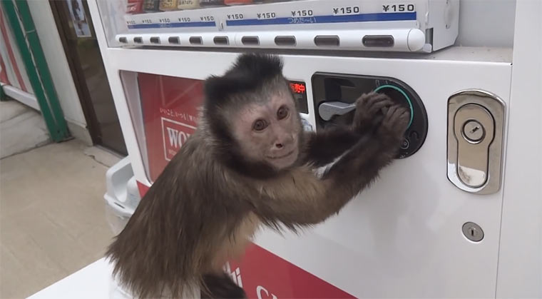 Wie cool ist das kleine Kerlchen hier denn bitte? Das kleine Äffchen ist perfekt darauf dressiert, mit Münzen zu einem Automaten zu gehen und eine Flasche Limo zu ziehen. Ganz alleine auf bekommt er sie noch nicht, aber er hat sich die Erfrischung redlich verdient. Hach, der perfekte Hausdiener wäre das…