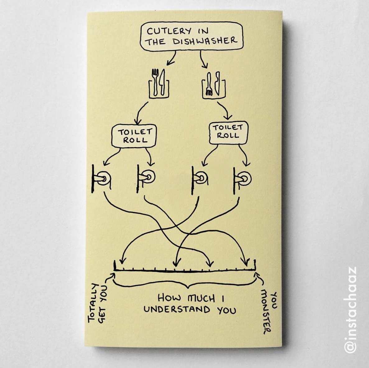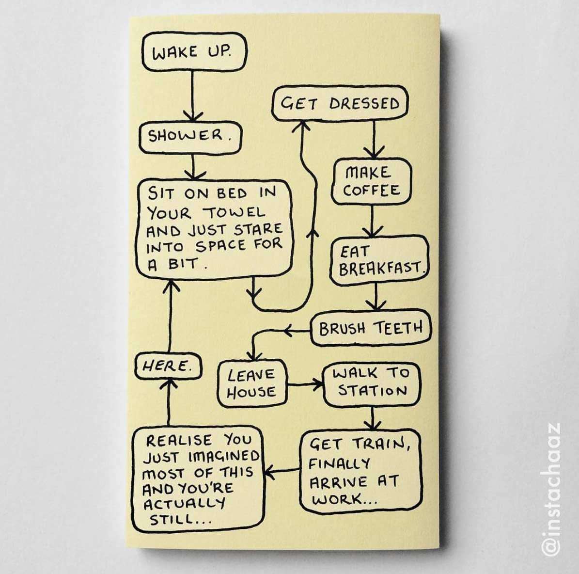 2015 hatte ich euch die tollen Post-It-Bilder von Chaz Hutton vorgestellt. Der Illustrator aus London hat seitdem fleißig das Leben und all seine Alltagsprobleme und -Momente in treffsicheren grafischen Motiven aufbereitet. Seien es kleine One-Panel-Comics, datenvisuelle Darstellungen oder mechanische Ablauf-Diagramme. Sie alle sind kreativ, beobachten gut das Leben und regen zum Nachdenken an.
