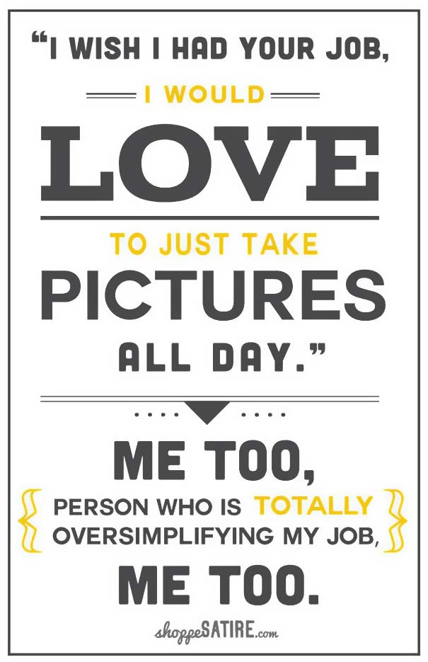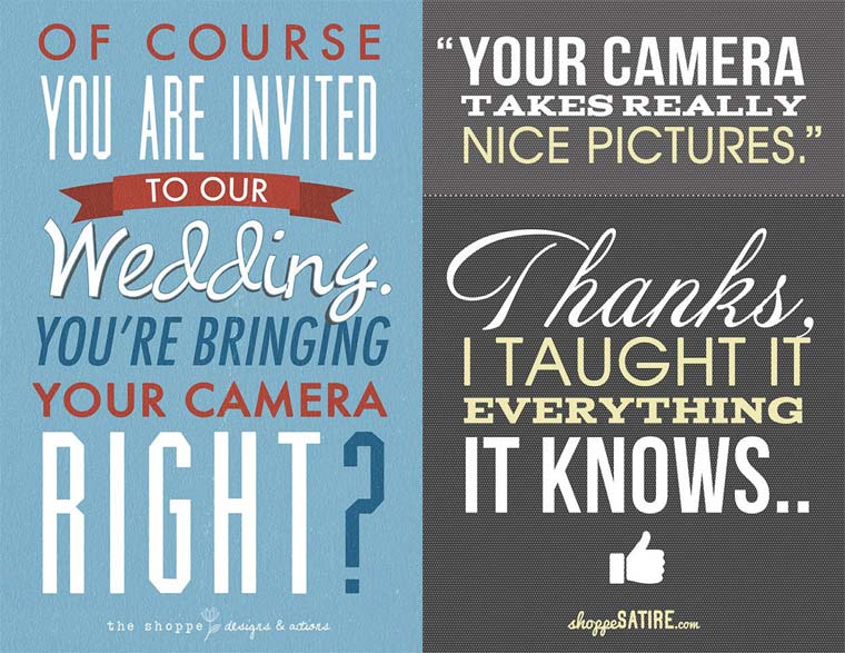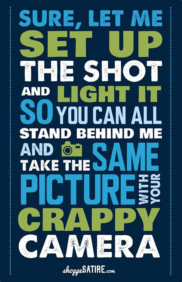 Schöne satirische Posterreihe von Shoppe Designs, die uns einige Illustrationen bzw. Typos zeigen, die Sätze offenbaren, die vermutlich jeder semi-professionelle Hobbyfotograf bereits zu hören bekommen hat. Läuft alles unter dem Label Shoppe Satire, aber genug Wahrheit ist definitiv dran.