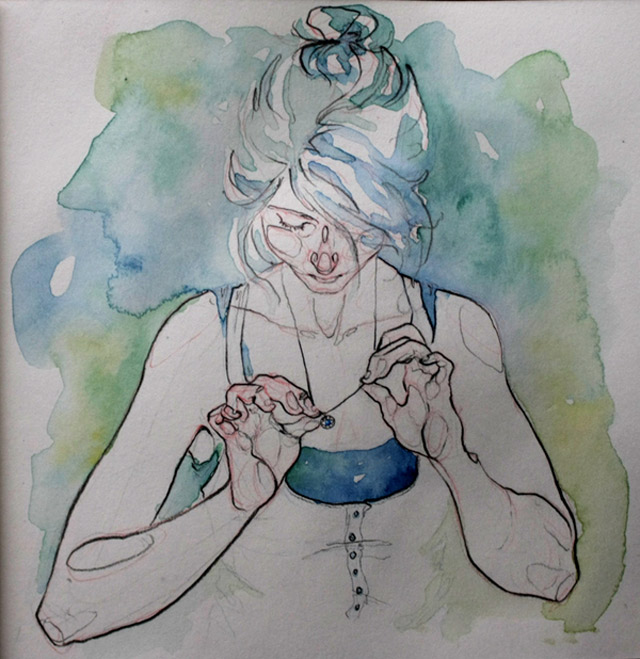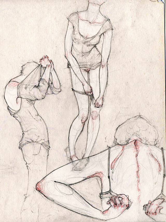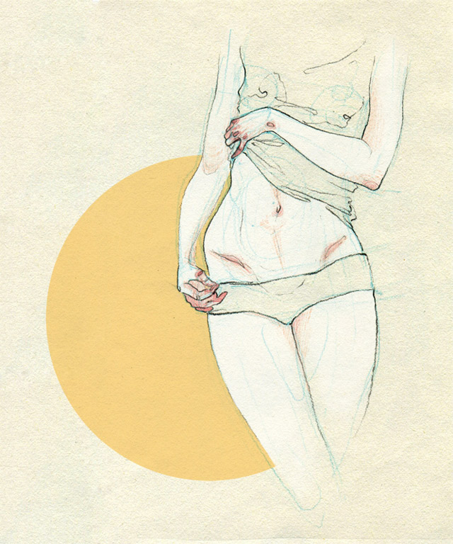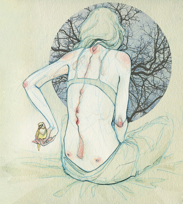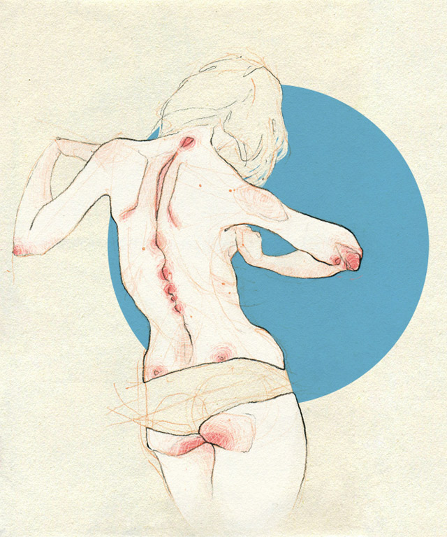 „My drawings are focused on the human body, its movements, expressions and feelings. I’m obsessed with the skin, the hands, the bones you can barely appreciate. My work is full of strong but delicate lines and colours.“