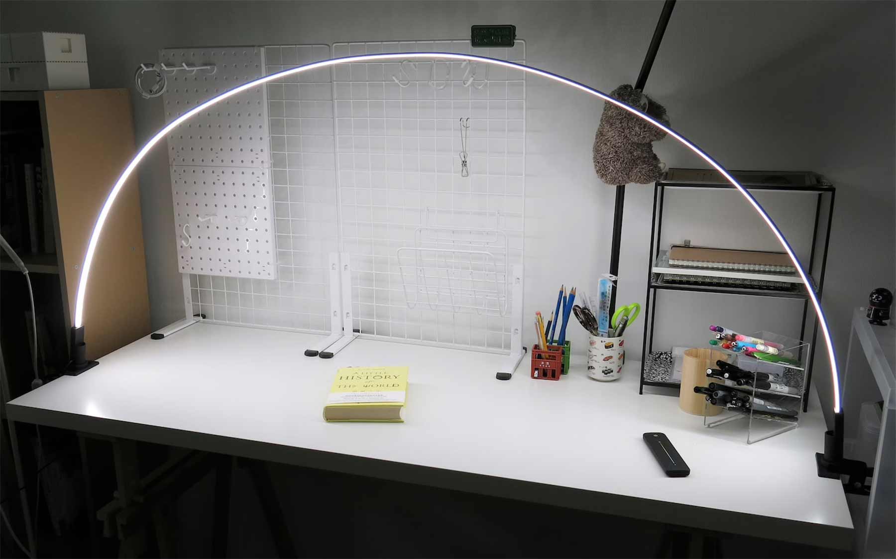 Schreibtischlampen sind ja immer so eine Sache. Oftmals wird da nur pointiert in einem kleinen Bereich wirklich gutes Licht geworden. Braucht man es an anderer Stelle, wird umgestellt, verbogen oder eine weitere Lampe hinzugezogen. Ganzflächig funktioniert das aber nur selten. Die ArchFlex LED-Lampe könnte da Abhilfe schaffen. Minimalistisches Design, das sich bogenhaft über den ganzen Tisch streckt und flexibel in Länge und Höhe positioniert sowie in der Lichtfarbe angepasst werden kann. Smart!