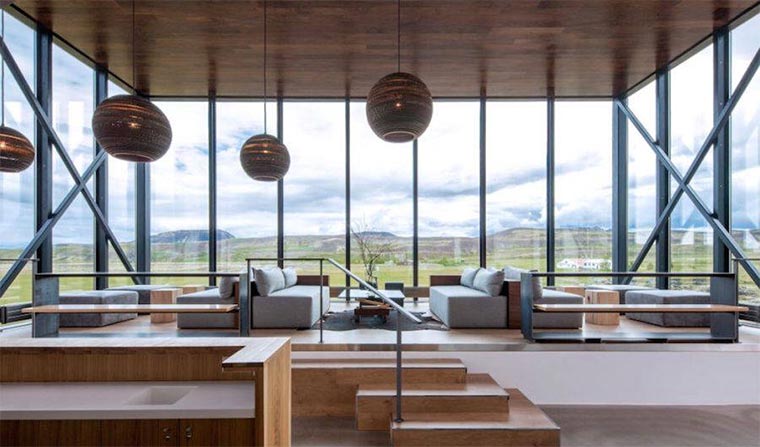 „ION’s austere past as an inn for workers at the Nesjavellir Geothermal Power Plant served as canvas for it’s future as a chic bolthole. The abandoned building was acquired in 2011 and — with the assistance of Santa Monica-based design studio Minarc — renovated, with a new wing also added.“