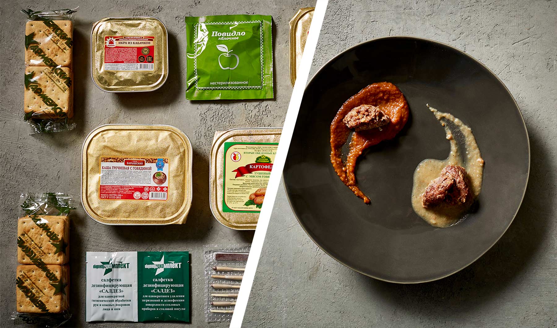 „MRE (Meals Read to Eat) are military combat rations provided to soldiers in the field of duty. Due to their unappetizing taste they have earnt the nickname ‚meals rejected by everyone‘. With this project we wanted to reimagine the meals and plate in a manner of a Michelin starred meal. In essence, taking the worst food, provided to the bravest people and visually elevate it as if it were being served in one of the world’s most revered restaurants.“