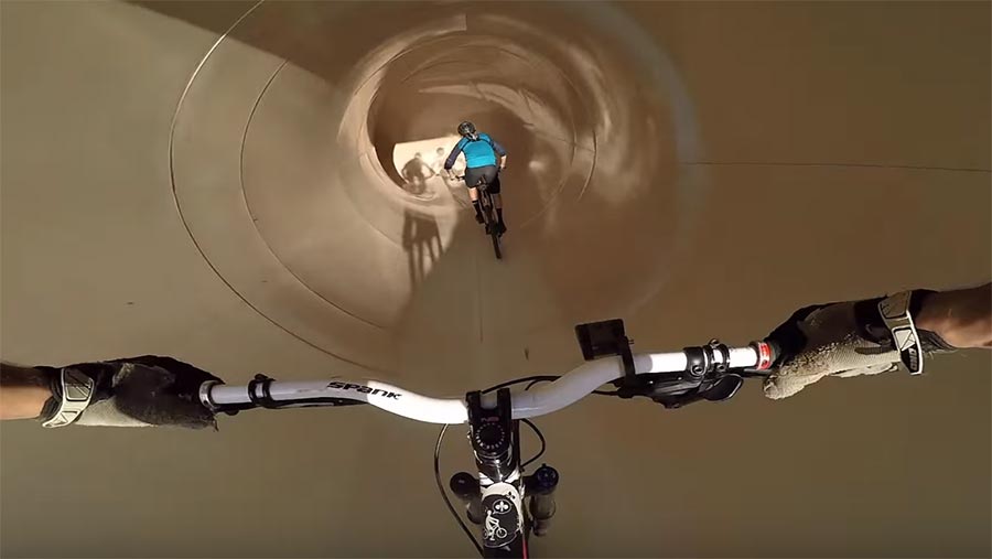 Nach z.B. Snowboardern, die durch einen verschlossenen und verschneiten Wasserrutschenpark fahren, gibt es bei dieser Mountainbike-Fahrt von Simon Drouin ein paar kanadische Rutschen zu sehen. Von Innen. Dank GoPro sind wir nämlich Helmnah mit dabei, wenn sich die Adrenalin-Junkies durchs runde Plastik werfen.