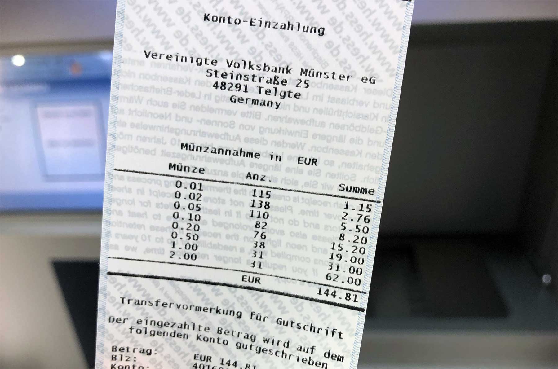 Der tatsächlich von mir eingezahlte Spardoseninhalt und somit die richtige Lösung des Schätzspieles summierte sich auf 144,81 Euro. Immerhin 14 Tipps lagen in einer Range von plus-minus-20 Euro darum (neun im Blog, lediglich fünf auf Facebook). Immerhin noch drei Tipps lagen höchstens zehn Euro entfernt (zwei im Blog, einer auf Facebook). 2,81 zu wenig hatte der Zweitplatzierte getippt (Sorry, Philip!), nur 66 Cent(!) zu viel der Erstplatzierte.
