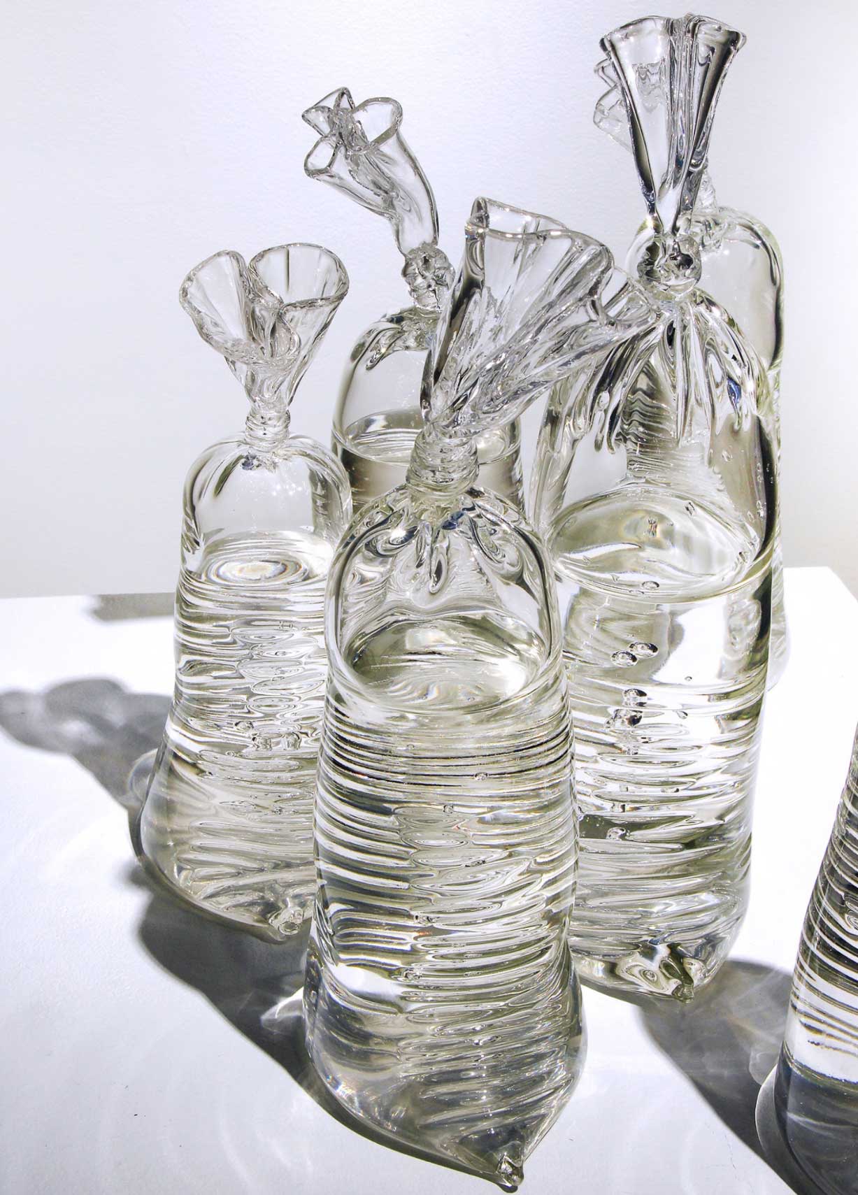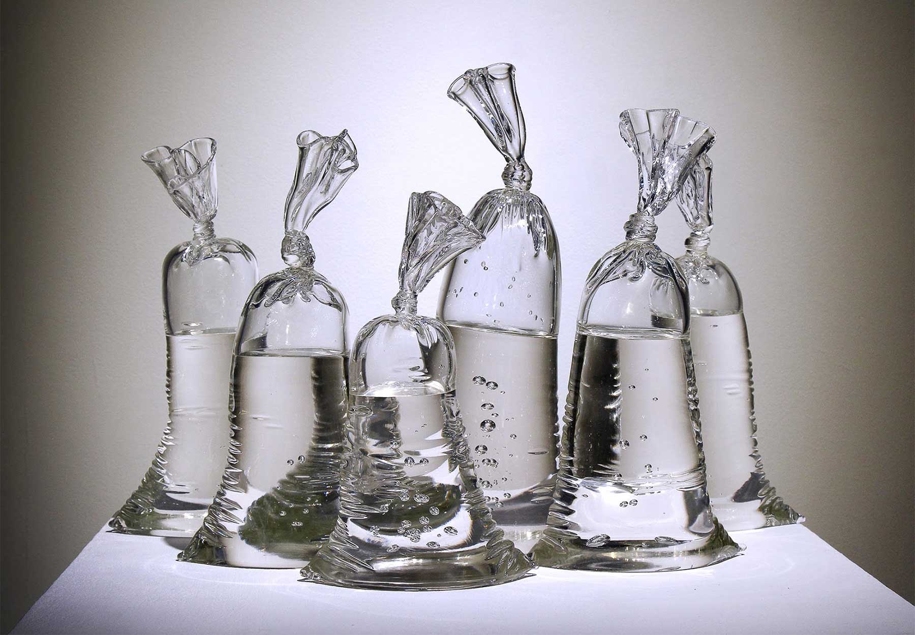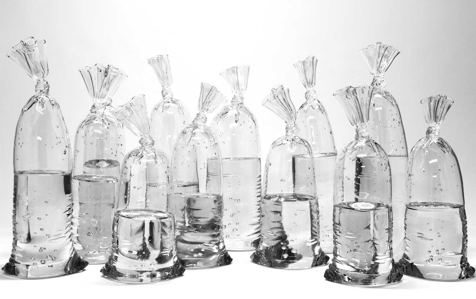 Nein, hier bekommt ihr weder Plastikbeutel noch Wasser zu sehen. Die Reihe „H2O/SiO2“ von Dylan Martinez besteht vollends aus Glas. Aus einer Mischung aus Glasbläserei und Skulptur-Techniken erschafft der amerikanische Künstler visuelle Irritationen, schafft er es doch ungemein realistisch die Weichheit und Beweglichkeit der vermeintlichen Materialien mit der kontrastierenden Härte des Glases zu erstellen. Ich mag sowas ja immer sehr, vor allem hier auch mit den kleinen Luftbläschen, die ausnahmsweise tatsächlich aus genau dem sind: Luft. Nur werden sie niemals bis zur „Wasser“-Oberfläche aufsteigen können…