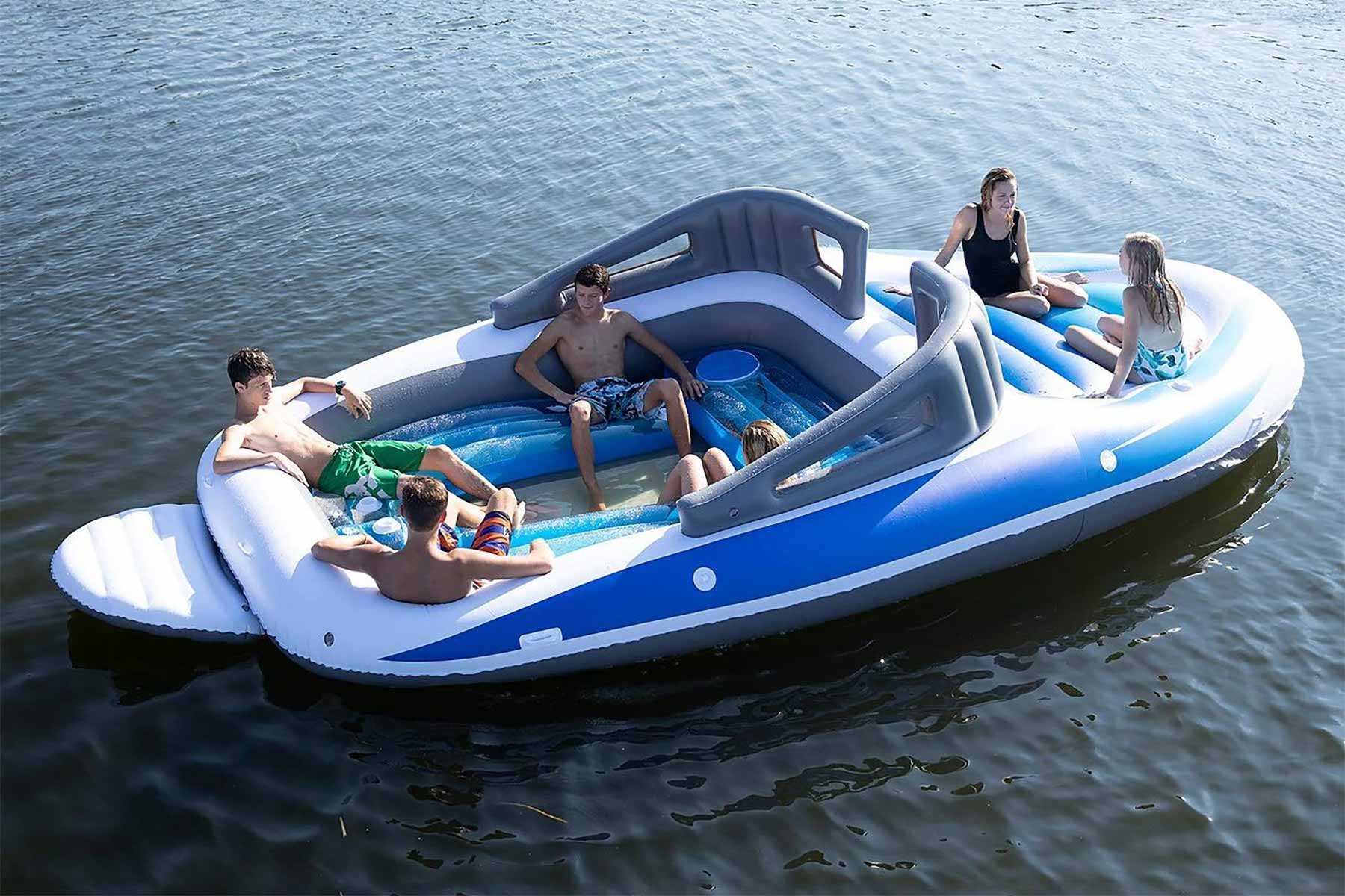 Was ist das denn bitte für ein cooles Gefährt? Beim aktuellen Supersommerwetter wünscht man sich ja am besten mit möglichst wenig Kleidung am Leib in einem möglichst frischen Gewässer. Ordentlich chillen kann man mit Freunden auf dieser aufblasbaren Badeinsel in Form eines Motorbootes. Beim US-Amazon kann man dieses gigantische Stück Wasserspielzeug kaufen (wobei aktuell lediglich über alternative Händler, neu ab 299 US-Dollar).