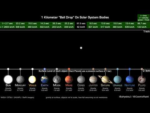 Dr James O’Donoghue zeigt uns, was passiert, wenn man auf allen größeren Himmelskörpern unseres Sonnensystems jeweils einen „Ball“ aus einem Kilometer Höhe fallen lässt. Schon krass, wie unterschiedlich Anziehungskräfte und atmosphärische Widerstände da arbeiten.