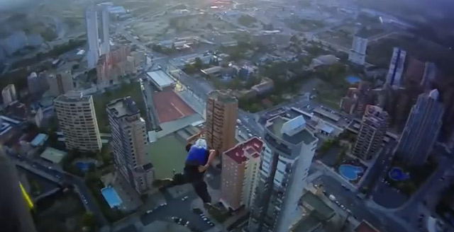 Die Basejumper Douggs, Carlos and Dario steigen unerlaubt auf das Hotel Bali in Benidorm, seines Zeichens das höchste Hotel Spaniens. Von Außen fahren sie mit dem Fahrstuhl bis nach oben, um dann weitaus schneller wieder den Rückweg anzugehen anzuspringen. Mit Helmkamera. Crazy!