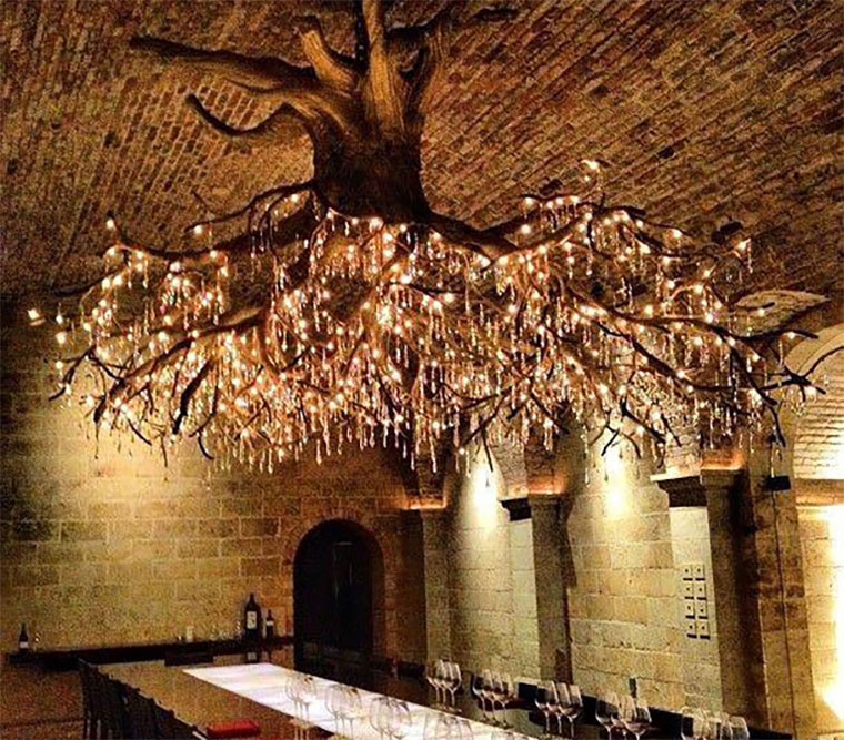 Ich liebe diese Licht-Idee von Donald Lipski und Jonquil LeMaster! Im kalifornischen Rutherford haben die beiden für den Wein-Hersteller Kathryn Hall einen Kronleuchter unter die Gewölbedecke gebaut, der ein gigantischer Baumstumpf samt Wurzelwerk ist. Als würde man direkt unter dem blühenden Rest samt Krone sitzen. Der Chandelier Room ist seither dank des Werkes Chilean Red eine absolute Sehenswürdigkeit mit seinen etwa 1.500 Swarowski-Kristallen. Einfach nur schön!