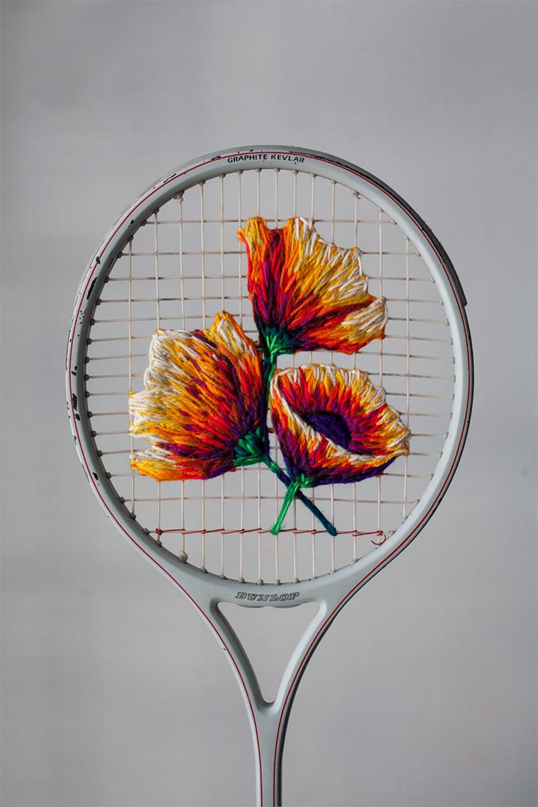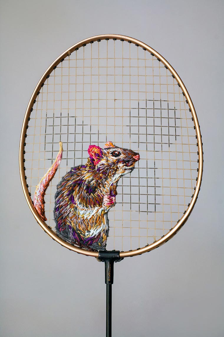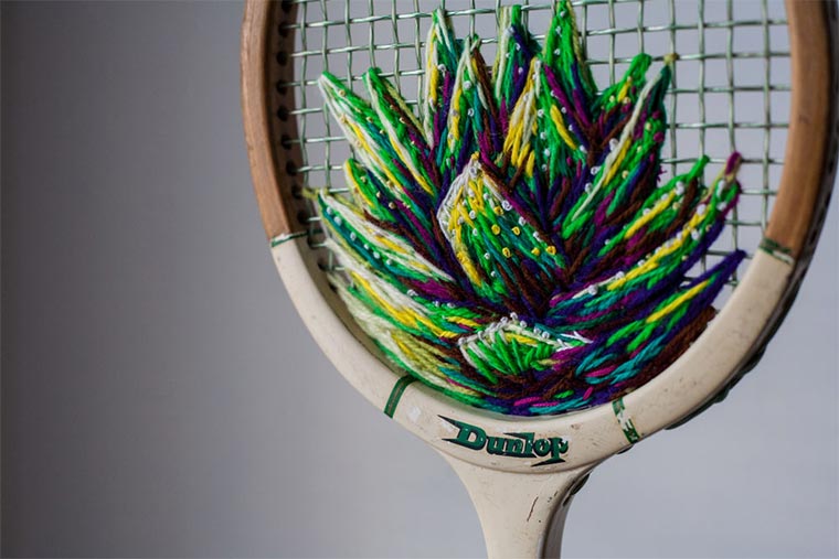Die „photographer-designer-vj-embroiderer“ Danielle Clough gibt als Motto „Sew far sew good“ an und demonstriert ihre Stick-Sucht mit den aller-skurrilsten Untergründen für ihre Arbeiten. Ob Tennisschläger-Netze, Maschendrahtzäune oder Sneakerstoffe – alles wird von der Künstlerin aus Kapstadt bestickt, was nicht bei Drei auf den Bäumen ist.