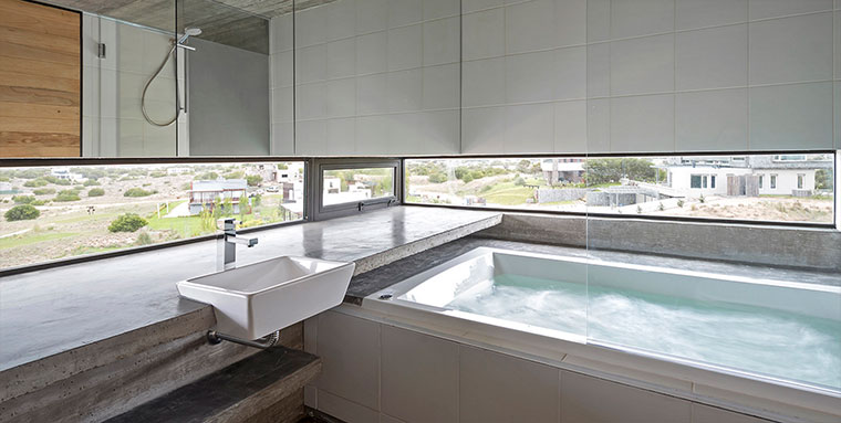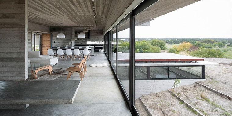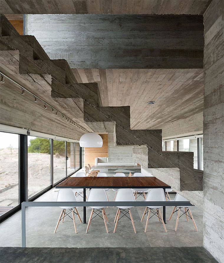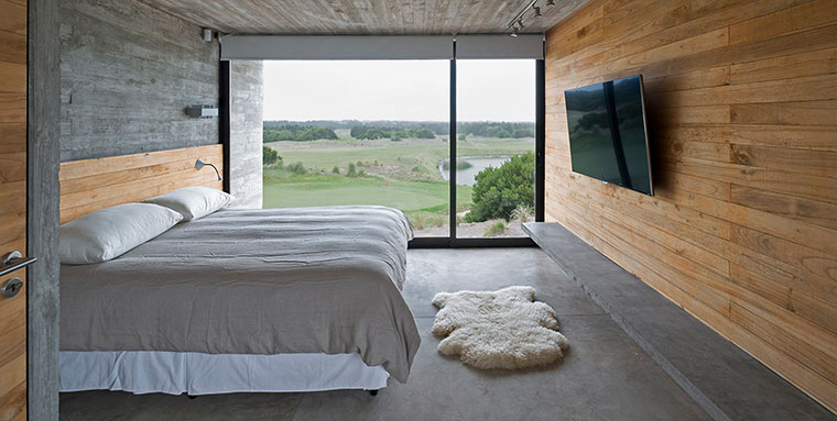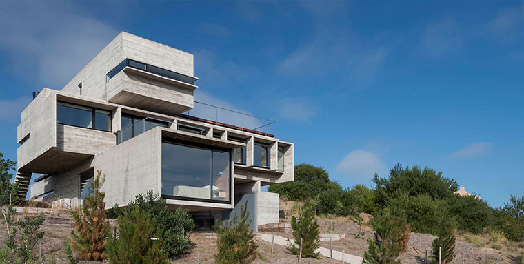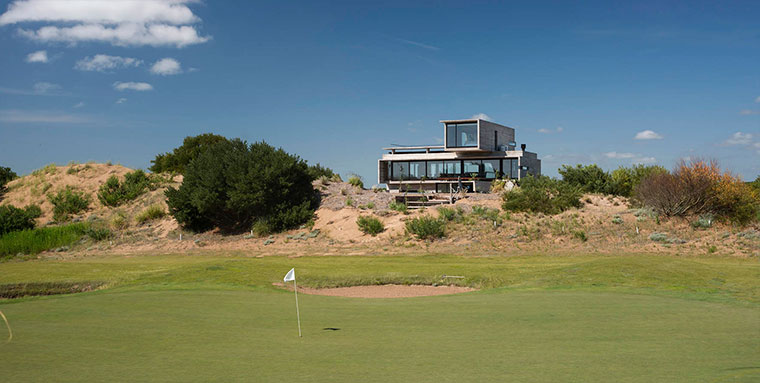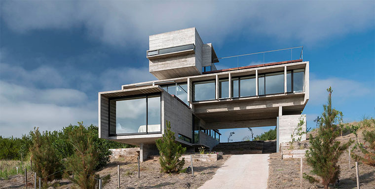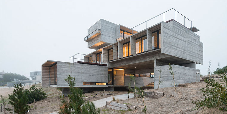 Drei gigantische Beton-Blöcke, die versetzt aufeinander liegen. So könnte man das Design des Wohnhauses in Buenos Aires zusammen fassen, das der argentinische Architekt Luciano Kruk entworfen hat. Okay, diese Kombination scheint er mehrfach anzuwenden, sind doch viele seiner Objekte aus eher minimalistisch-starren Beton-Strukturen erbaut. Bei der Casa Golf ist aber direkt ein Golfplatz angebunden. Das dürfte einzigartig sein…