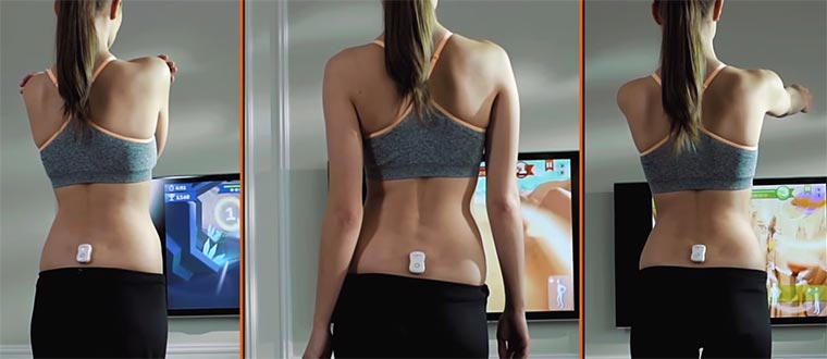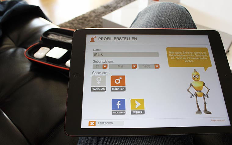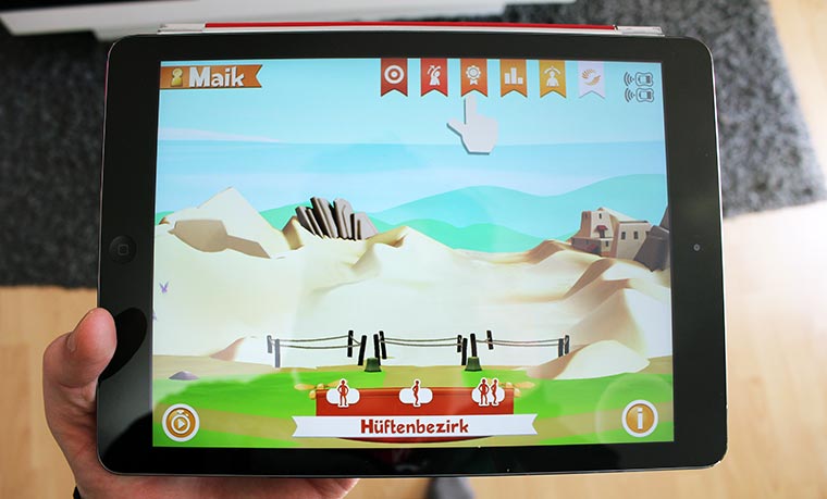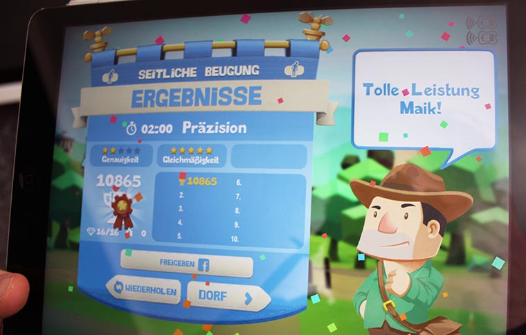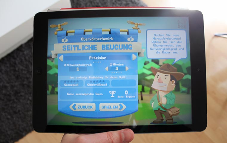 Der Grundgedanke passt. Hat die Wii ihrer Zeit es geschafft, Sofa-Muffel zur Bewegung zu bringen, wurde das Thema jetzt wissenschaftlich angegangen. Speziell der Rückenbereich macht PC-Arbeitstieren wie mir zu schaffen. Mittels zweier Bewegungs-Sensoren, die an Steiß- und Brustbein angelegt werden kann per Bluetooth-Verbindung mit dem Mobile-Device (iPad 3 & höher, iPad Mini, iPhone 5 & höher; Android auch möglich) die Bewegung von Becken und Rücken in alle Richtungen verfolgt werden.