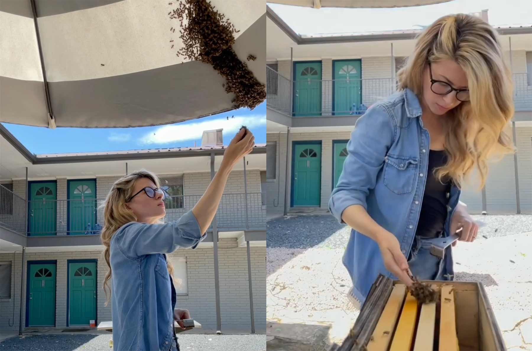 Tatsächlich habe ich von „Texas Beeworks“, wie die Firma von Thompson heißt, parallel noch ein Video gezeigt bekommen, in dem sie einen Schwarm aus einem ungewöhnlichen Ort befreit: einer Toilette.
