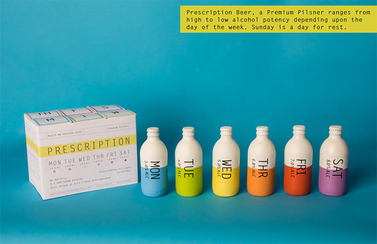 Designer Peter Jostrand aus New York schenkt uns mit Prescription Beer ein Sixer-Pack der besonderen Art. Die Flaschen sind in Form von medizinischen Pillen gehalten und das komplette Konzept durchzieht eine „ärztliche“ Anordnung, die den Genuss einer bestimmten Biersorte (die sich jeweils durch ihre Umdrehungen unterscheiden) pro Wochentag zu sich zu nehmen. Am Sonntag ruht der Körper und gönnt sich eine Pause.