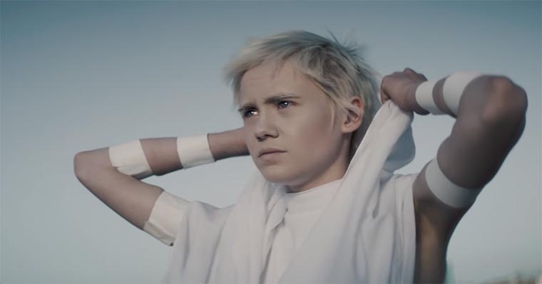 Hier jedenfalls der Clip mit ganz viel Luft-Fuchteln im Wald, einer geometrisch interessanten Skulptur und einer Frau mit weißen Haaren.
