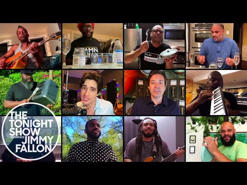„Brendon Urie joins Jimmy and The Roots to perform a social-distancing remix of Queen and David Bowie’s hit „Under Pressure“ with instruments found at home while in quarantine.“