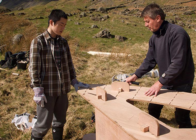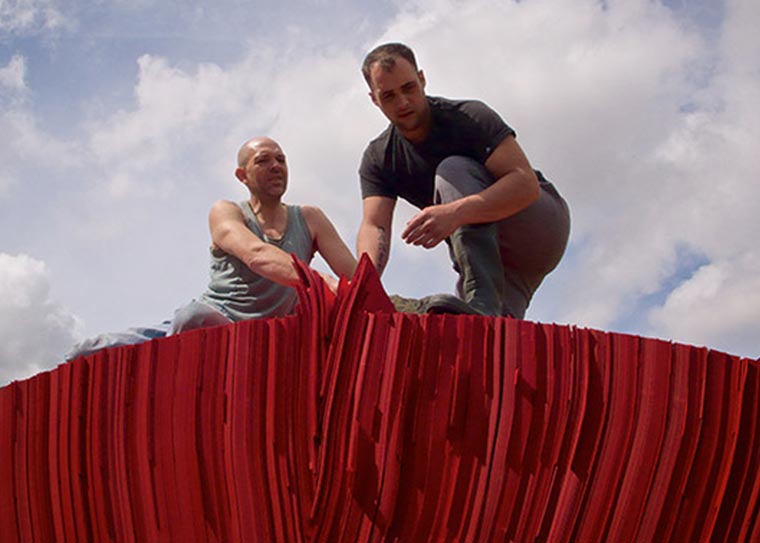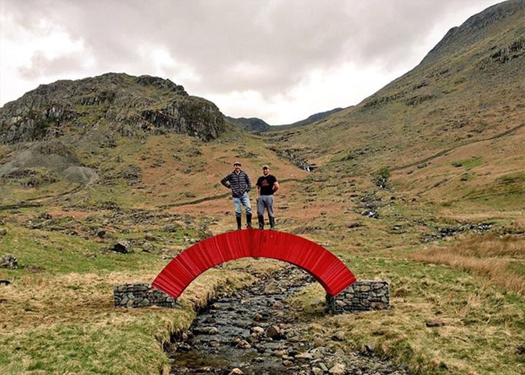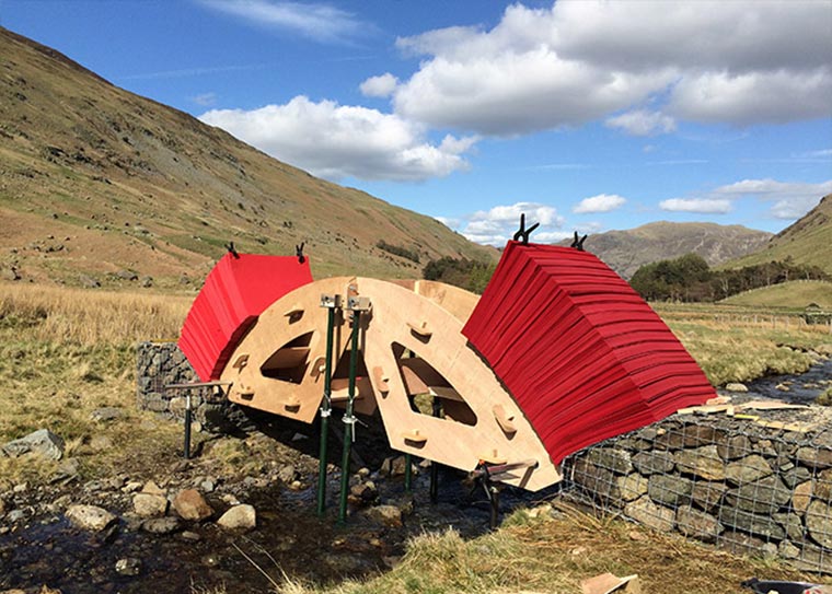 „On an aesthetic level the piece acts as a focal point within a vast open landscape. The bright red colour drawing the eye and interfering with the natural environment, while at the same time creating compositional balance with the green backdrop and flow of water.“