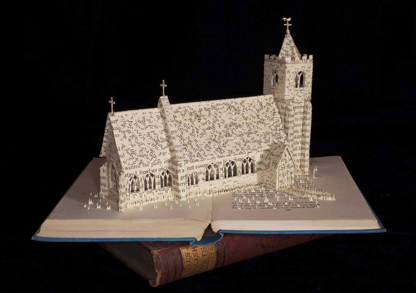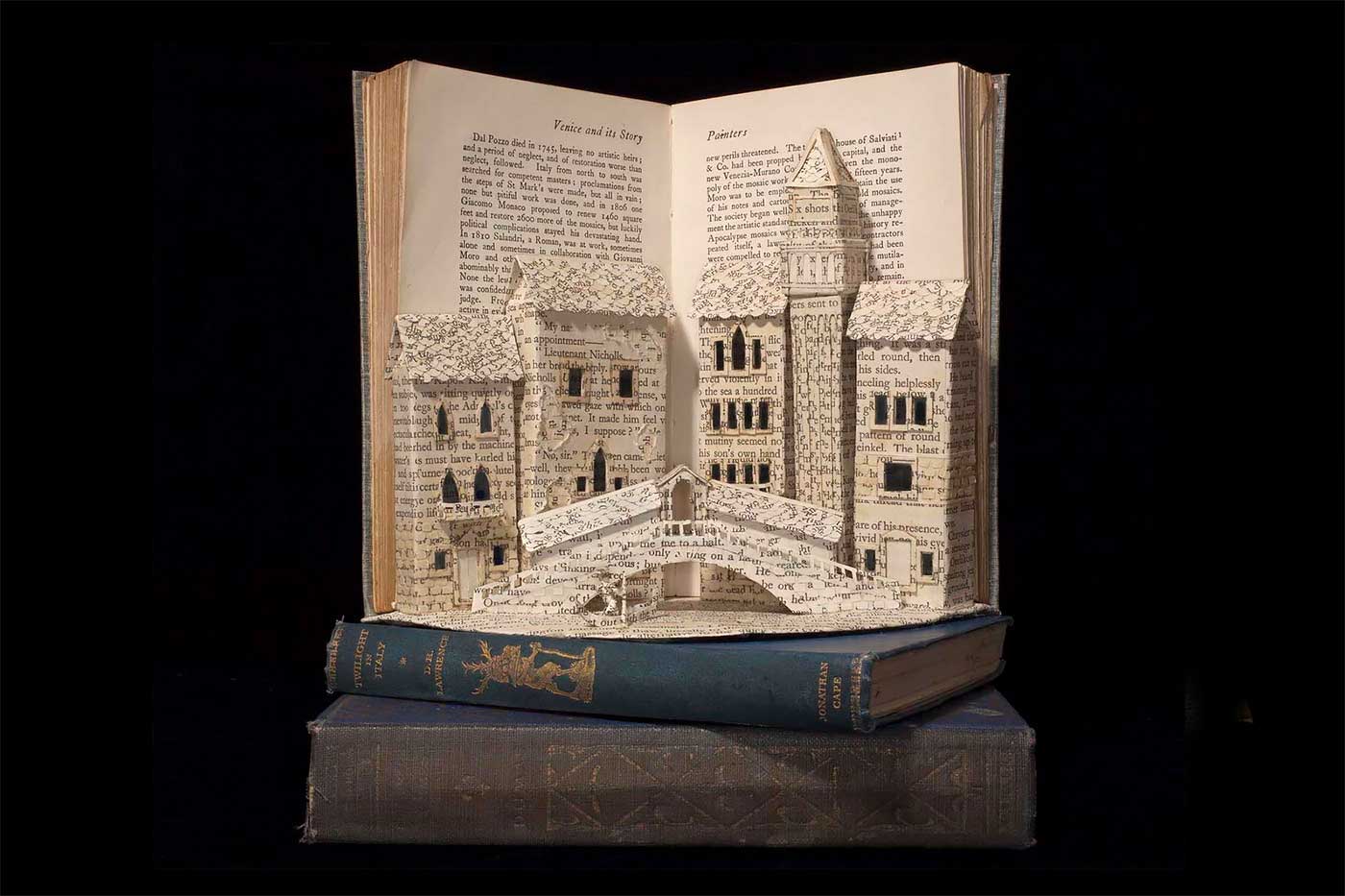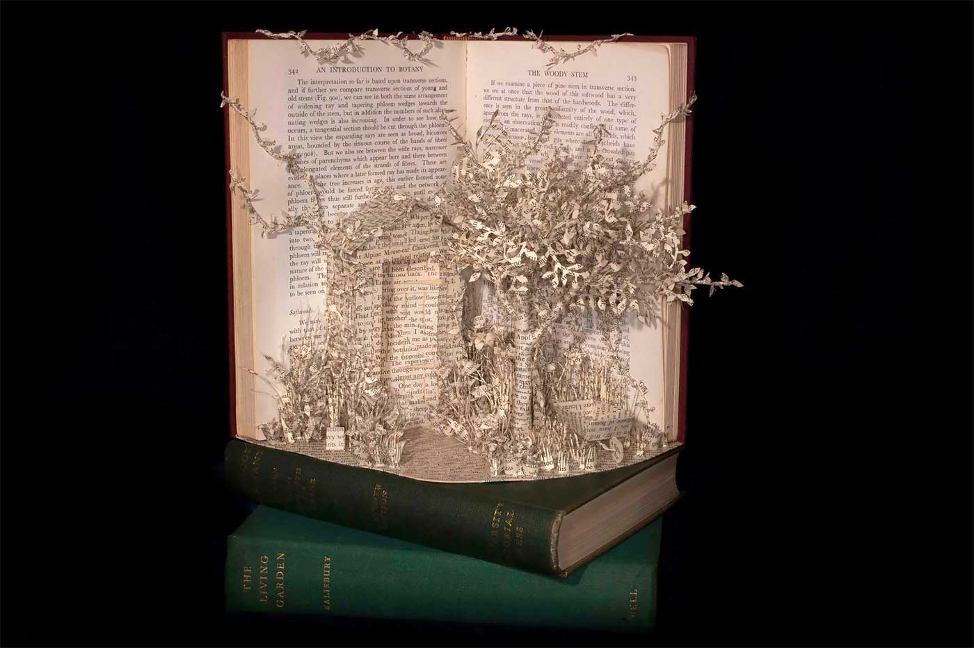 „Book sculpture is my creative outlet to highlight an appreciation of the little things in life. A good book, a beautiful tree, a flower in full bloom. With my scissors, glue and paper, and led by the title of the books I chance upon in antique and charity shops, I am able to recreate plants, animals, architecture and literary scenes with all the details I love on a manageable scale.“ (Artist Statement)