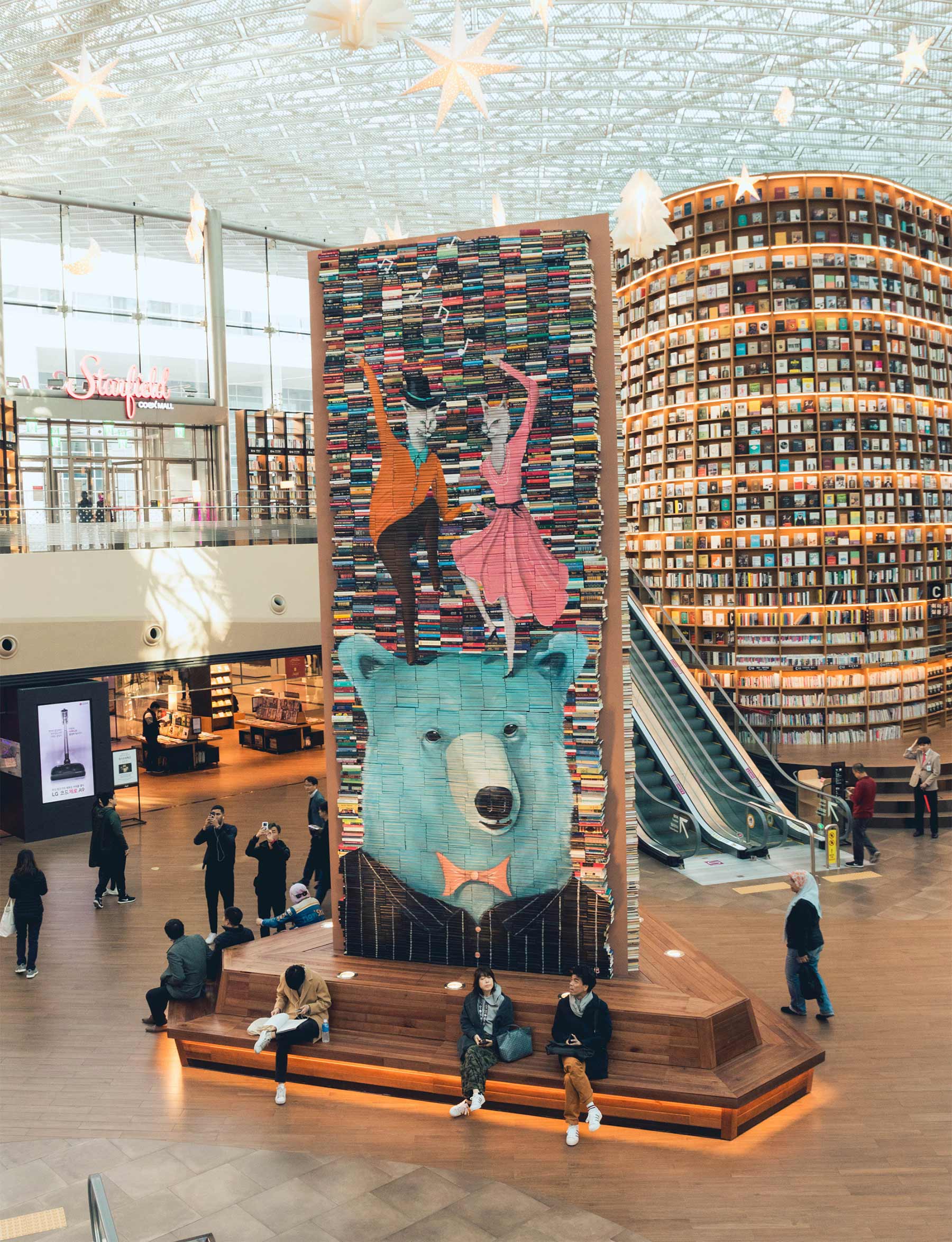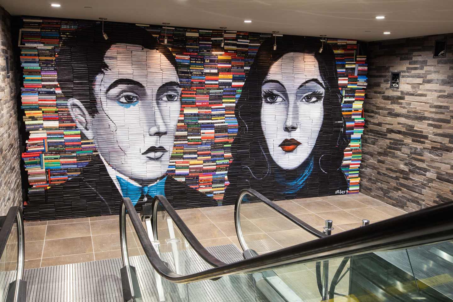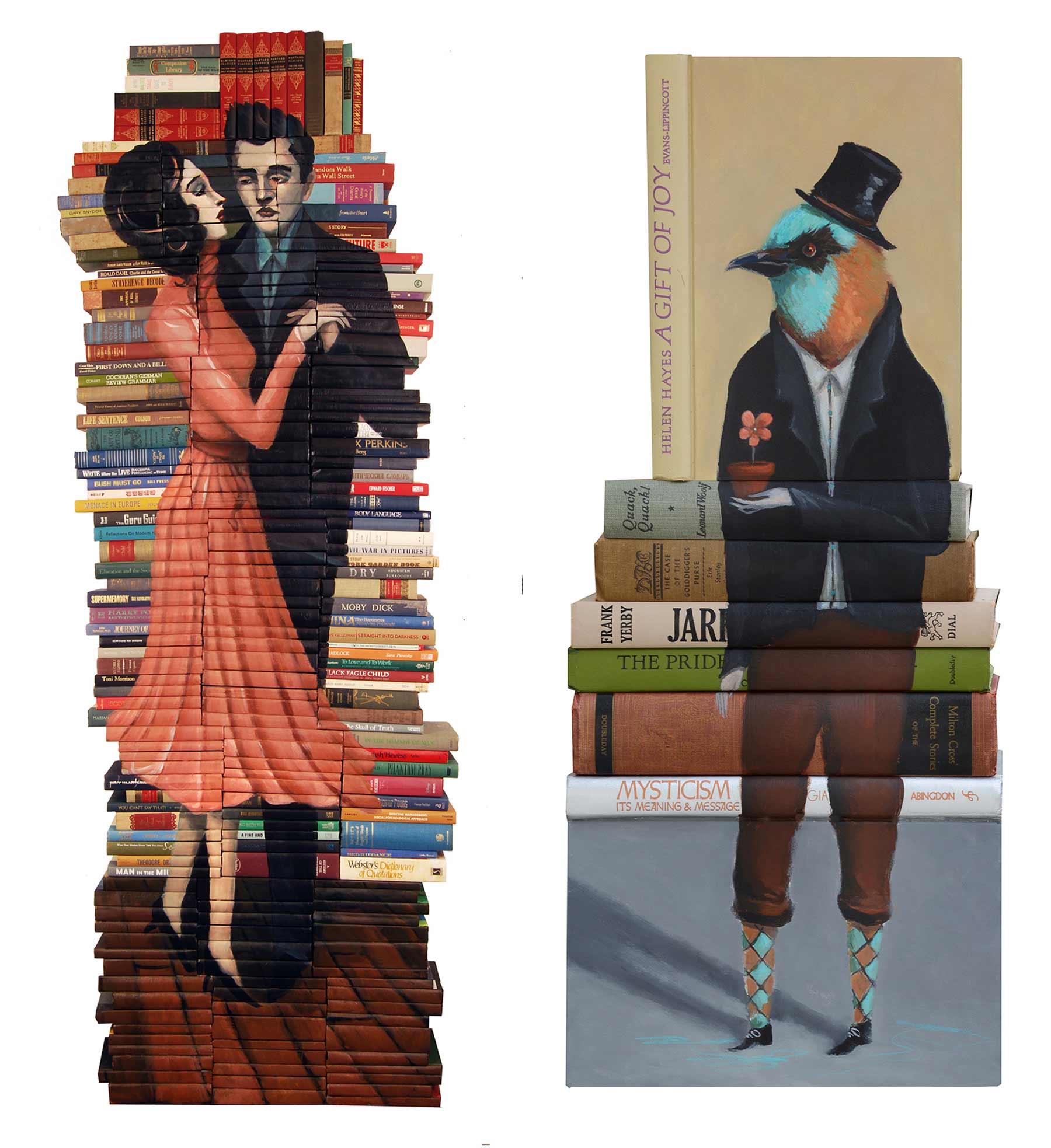 Der amerikanische Künstler Mike Stilkey malt auf einem ganz besonderen Untergrund: Büchern. Nicht etwa auf deren Seiten, was den Zeichnungen von Mark Powell ähneln würde, sondern auf den Buchrücken. Übereinandergestapelt ergeben die Bücher so auch eine mal mehr mal weniger gigantische Skulptur-Haptik. Und eine Mosaik-Optik kommt dann der unterschiedlich-farbenen Einbände auch noch hinzu. Gefällt mir sehr!