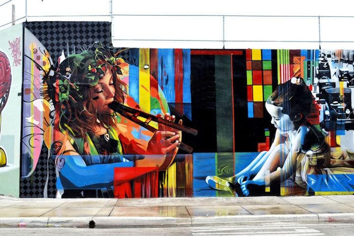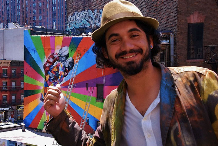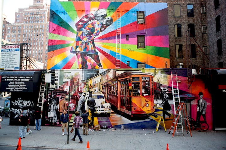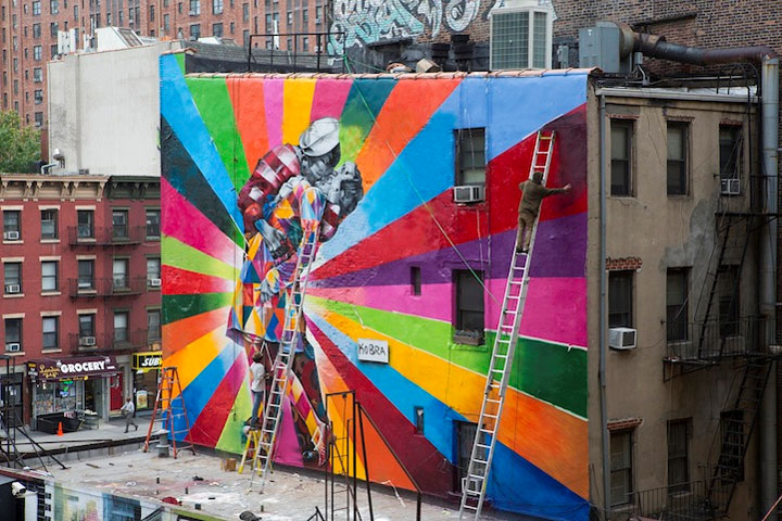 Tolle Street Art von Eduardo Kobra aus Sao Paulo, der riesige bunte und stylische Malereien an gigantische Häuserfassaden malt. Wie dieses obige Piece in New York. Die stark geometrisierten und farbenfrohen Stücke dürften noch den grauesten Stadtteil aufhellen. Einfach ganz toll anzusehen, würde mich interessieren, wie lange er für solche Stücke im einzelnen braucht. Und wie schwer es ist, dafür eine Genehmigung zu erhalten…