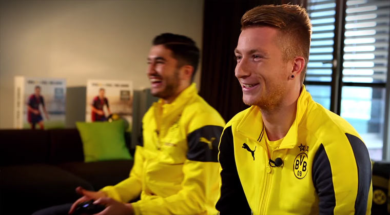 Dass die BVB-Profis (und vermutlich auch Spieler anderer Fußballvereine) ganz gerne mal den digitalen Fußballplatz unsicher machen und Spiele untereinander austragen, ist bekannt. Sehr schön finde ich, dass Fifa den Jungs die Möglichkeit gibt, ihre Duelle in der Öffentlichkeit auszutragen. Marco Reus, Nuri Sahin, Ilkay Gündogan und Mustafa Amini haben sich zum Team-internen Fifa 15-Turnier zusammen gefunden. Und dabei geht es hoch emotional zur Sache, die Jungs haben richtig Spaß dabei gehabt. Wer mag wohl den Sieg davon tragen?