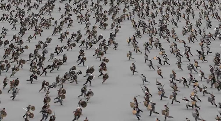 Schöne kleine Demo von Massive, die einfach mal massiv viele Schwert-behangene Krieger aufeinander los rennen lassen. Eine Figur zu animieren ist ja immer das eine, aber flüssiges Darstellen von Tausenden Figürchen? Krass… Ich gehe dann mal Arbeitsspeicher kaufen.