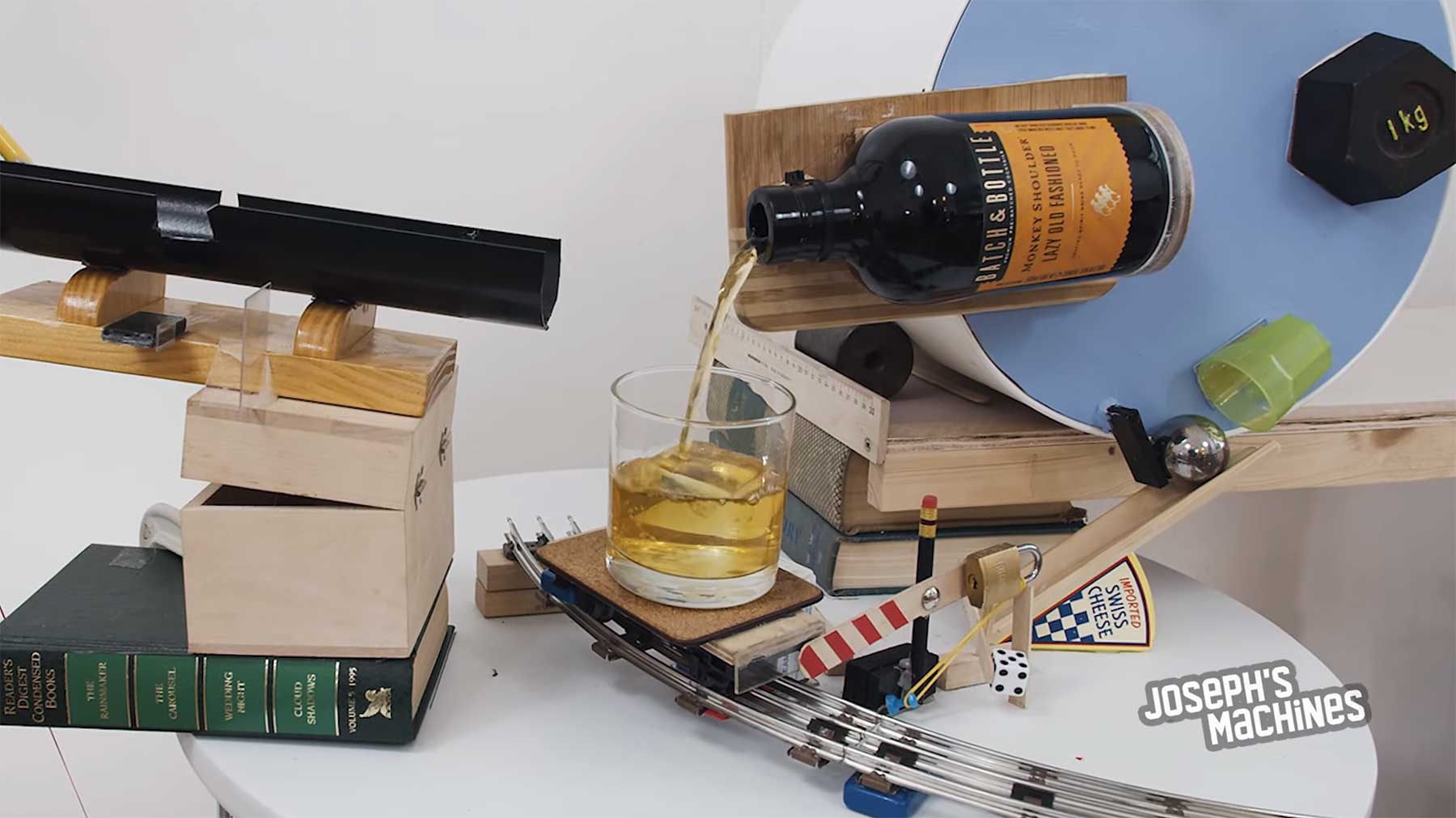 „Ice cubes slide down a track into a glass. A wheel rolls with a bottle of whiskey attached, making a perfect pour. Finally a drill rotates an orange against a peeler, and a toy train delivers the drink onto a coaster. All without lifting a finger. This is the laziest way to make an Old Fashioned!“