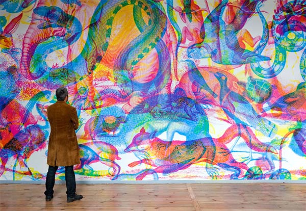 Alles eine Frage der Farbe. Zumindest bei den Arbeiten des Mailändischen Künstler-Duos Carnovsky, bestehend aus Francesco Rugi und Silvia Quintanilla. In ihrer Ausstellung RGB sieht die Wand wie ein farbliches Potpourri aus, bis jemand das Licht umschaltet. Denn unter rotem, grünem oder blauem Licht, schaut die Wand gleich ganz anders aus. Interessante Idee.