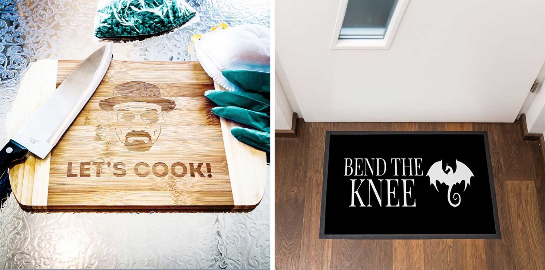 Wie wäre es zum Beispiel mit einer Jon Snow weiß gar nichts-Tasse oder einer Bent the knee-Fußmatte aus „Game of Thrones“? Für „Breaking Bad“-Liebhaber gibt es auch unter anderem ein Heisenberg-Schneidebrett zum „Kochen“. Und Star Wars-Eierbechern oder Geschenk-Sets gibt es auch.