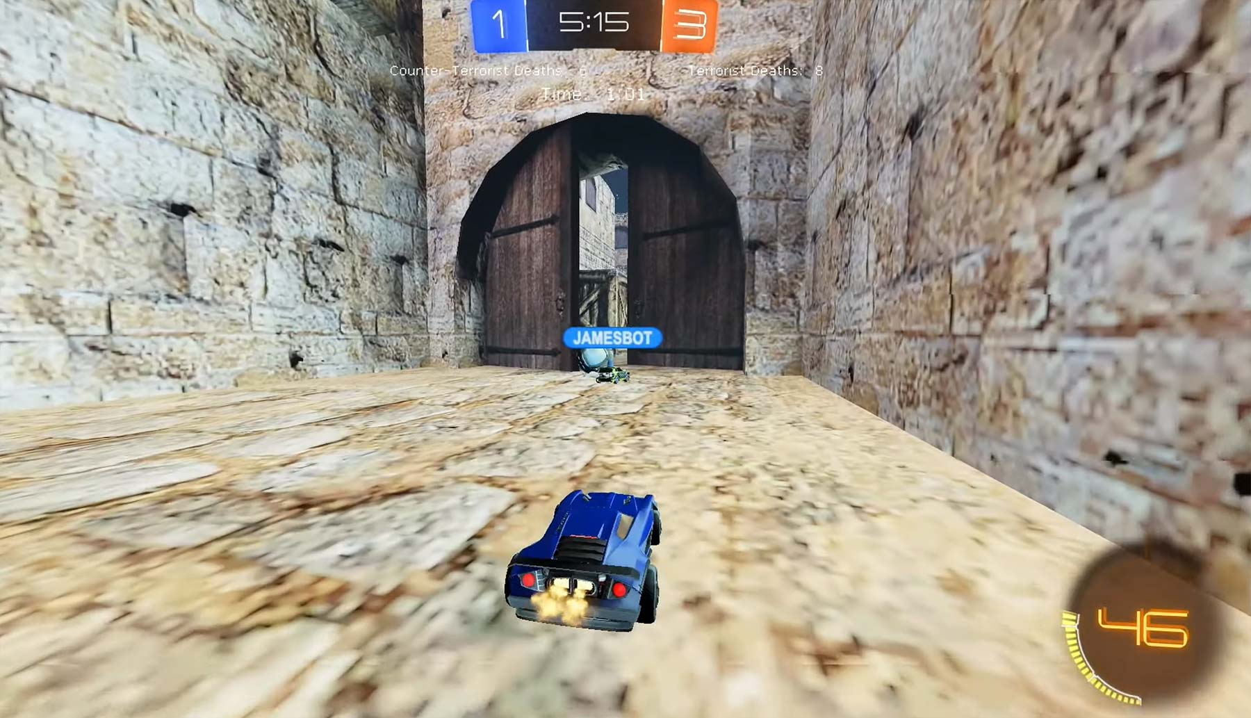 „Rocket League“-Map-Creator Lethamyr (zuvor hier) hat den Autofußball-Titel zum Shooter umfunktioniert. DIE Klassiker-Map schlechthin aus dem Shooter „Counter Strike“, „de_dust“, wurde von ihm nachgebaut und das Gameplay entsprechend angepasst. Das Terroristen-Team muss Tore schießen, die an den beiden entsprechenden Bomben-Plätzen angesiedelt sind, die Counter-Terroristen selbiges für drei Minuten verhindern. Oder aber man bringt einfach 10 Mal Spieler des Gegners um. Noch ist die Umsetzung nicht ganz fehlerfrei und gerade die Demos passieren noch recht leicht, so dass es häufig zu Double-Demos kommt, aber das schaut schon spaßig aus. Und ist mal wieder ein Beweis dafür, wie viel man aus so einem Basis-Spiel herausholen kann, wenn die Fanbase pfiffig und kreativ genug ist. Chapeau!