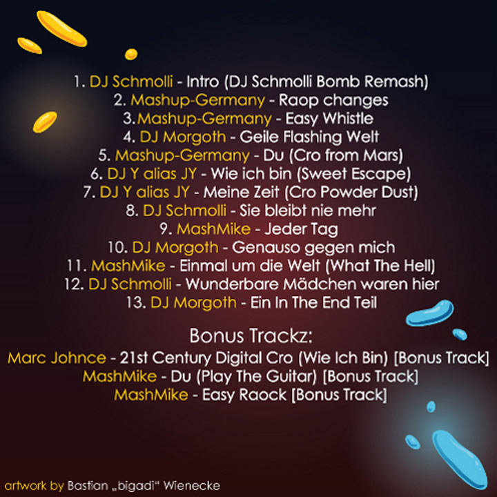 „Auf dem Album sind 13 Produktionen von DJ Morgoth, DJ Schmolli, Mashup-Germany, MashMike, DJ Y alias JY und Marc Johnce zu finden.“