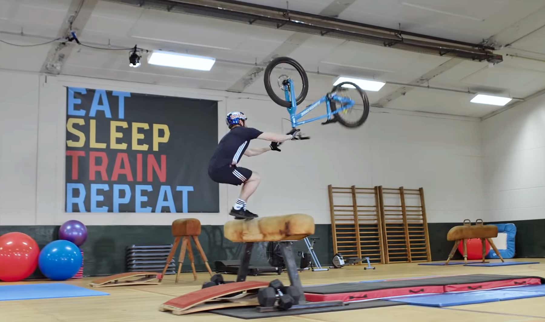 „New Year, New Tricks. Scottish Trials Bike legend Danny MacAskill shows us in his new film ‘Gymnasium’ that there are other ways to make your mark in the gym. Not a regular gym-goer by his own admission, YouTube sensation Danny stars in his new film and attempts to show the world that staying in shape doesn’t have to be daunting. In his latest return to our screens, Danny seeks refuge from the ‘New Year, New Me’ craze by creating his personalised fitness playground in a long forgotten hall at his local sports complex. Even though performing a perfect bar routine while still on two wheels isn’t for everyone, Danny has found that it’s a case of no chain, no gain as he’s able to do what he loves and stay in shape at the same time.“
