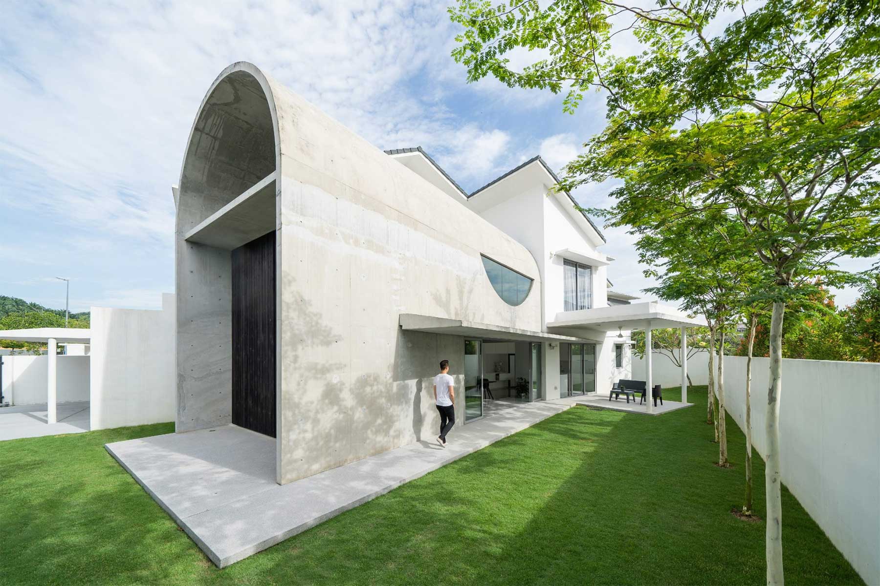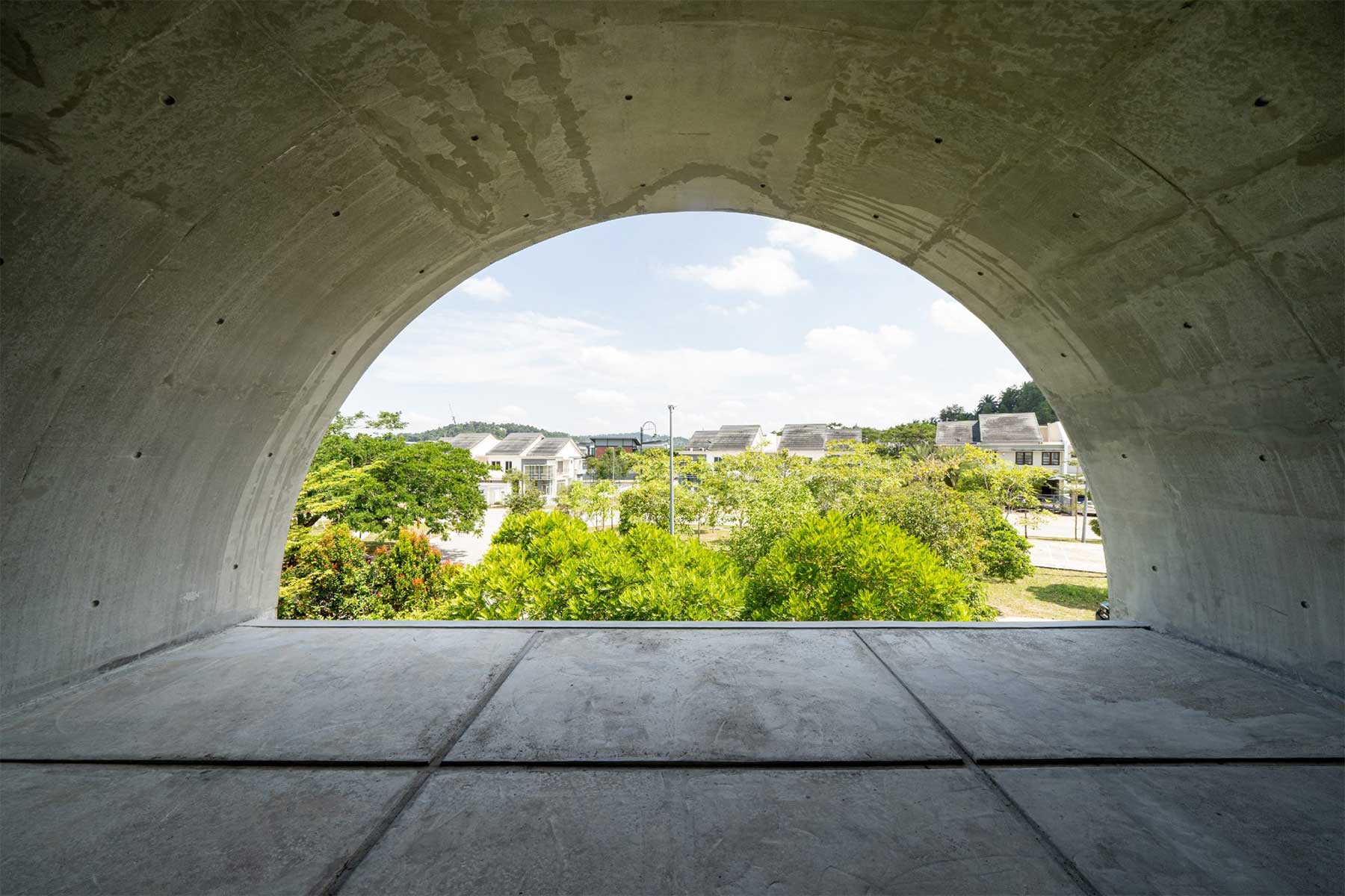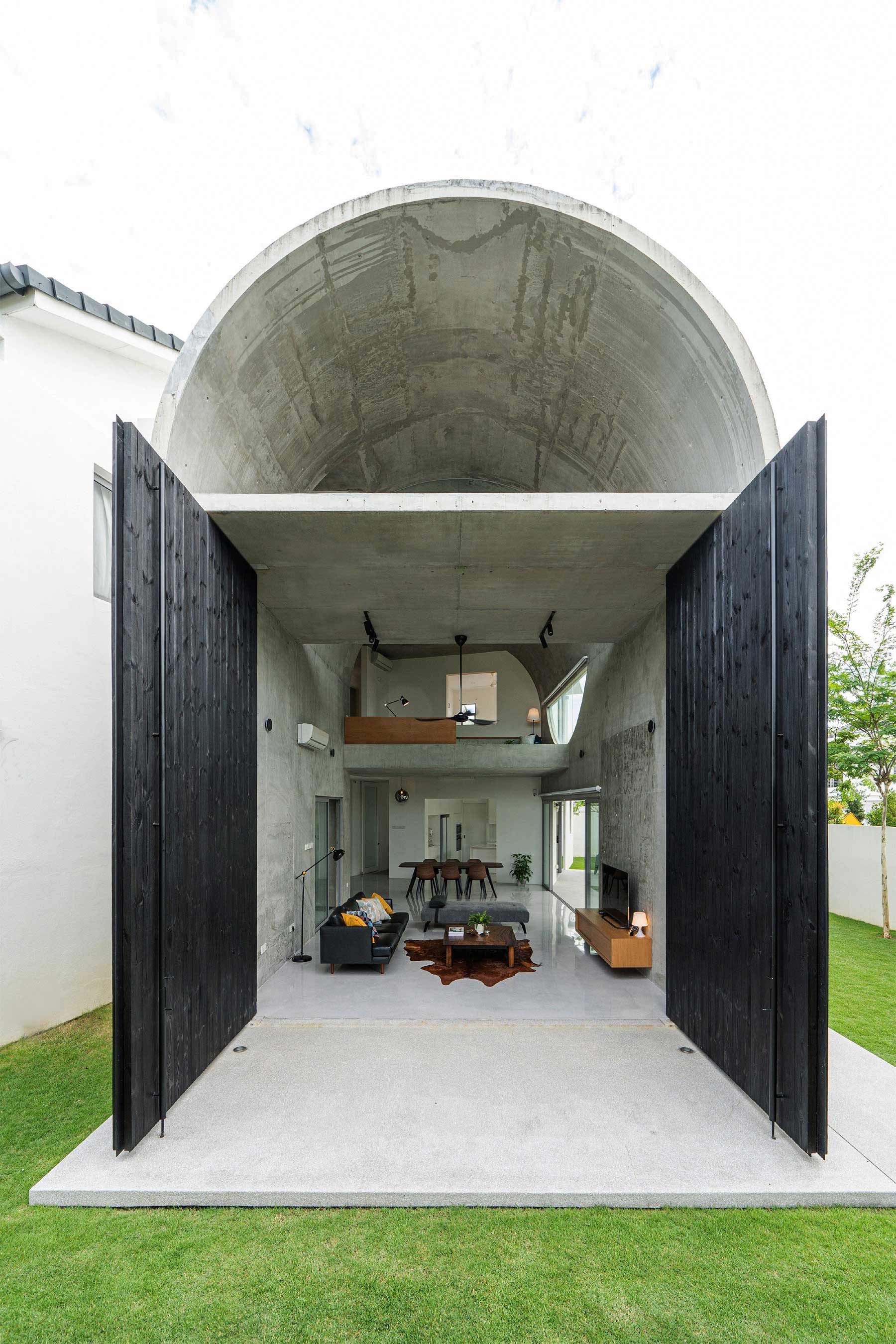 „The new form is intended to be simple but bold; contrasting it with the existing fabric of tropical suburban homes. From plan view, the living spaces were orientated parallel to the site boundary, resulting in a ‚break‘ between the original and new spaces. The triangulated ‚break‘ acts as a secured ventilated light well, cooling both sides naturally. An arch roof extends outwards, creating a vaulted annex that forms the living spaces. The space appears continuous through the extension of the arch and exaggerated further through the materiality of the concrete finish from floor to ceiling. The extension is further enhanced by two large doors that opens up to the garden. The uninterrupted perspective from inside out immediately connects the interior with nature.“