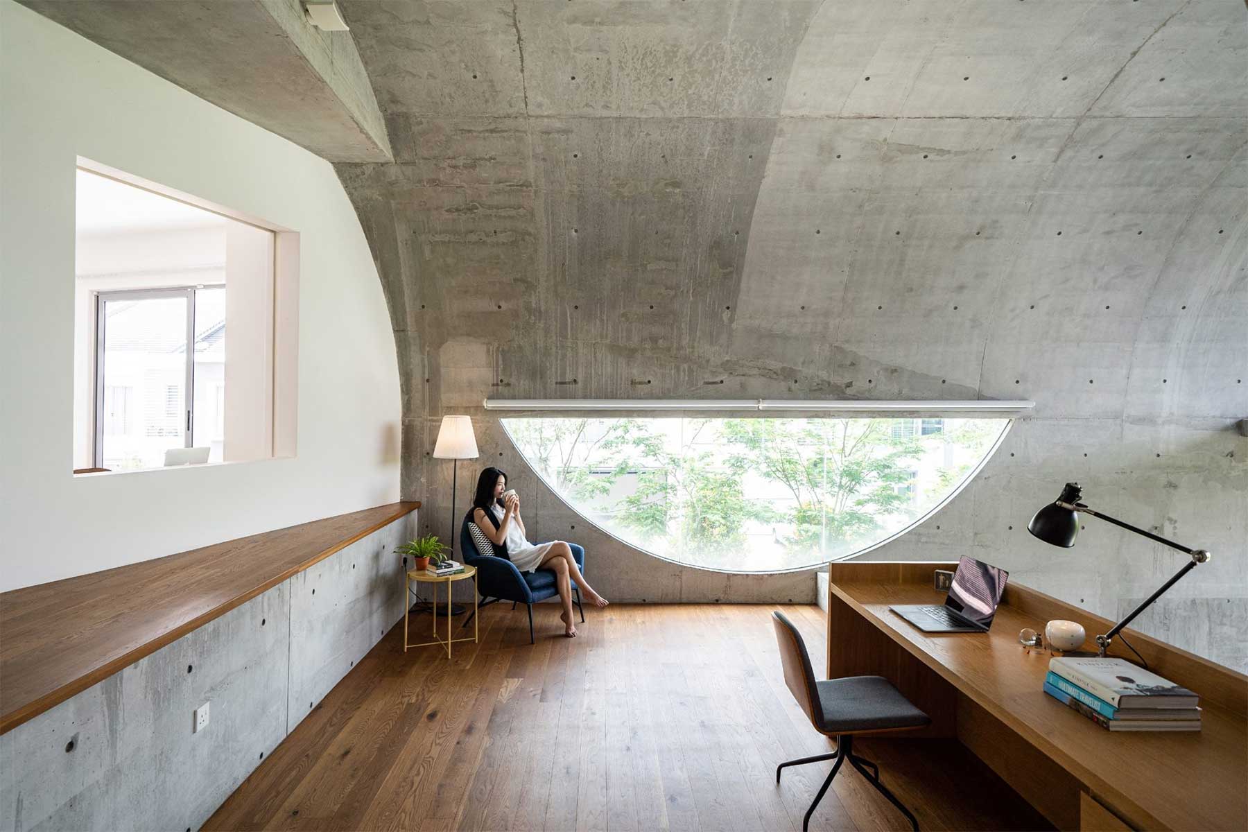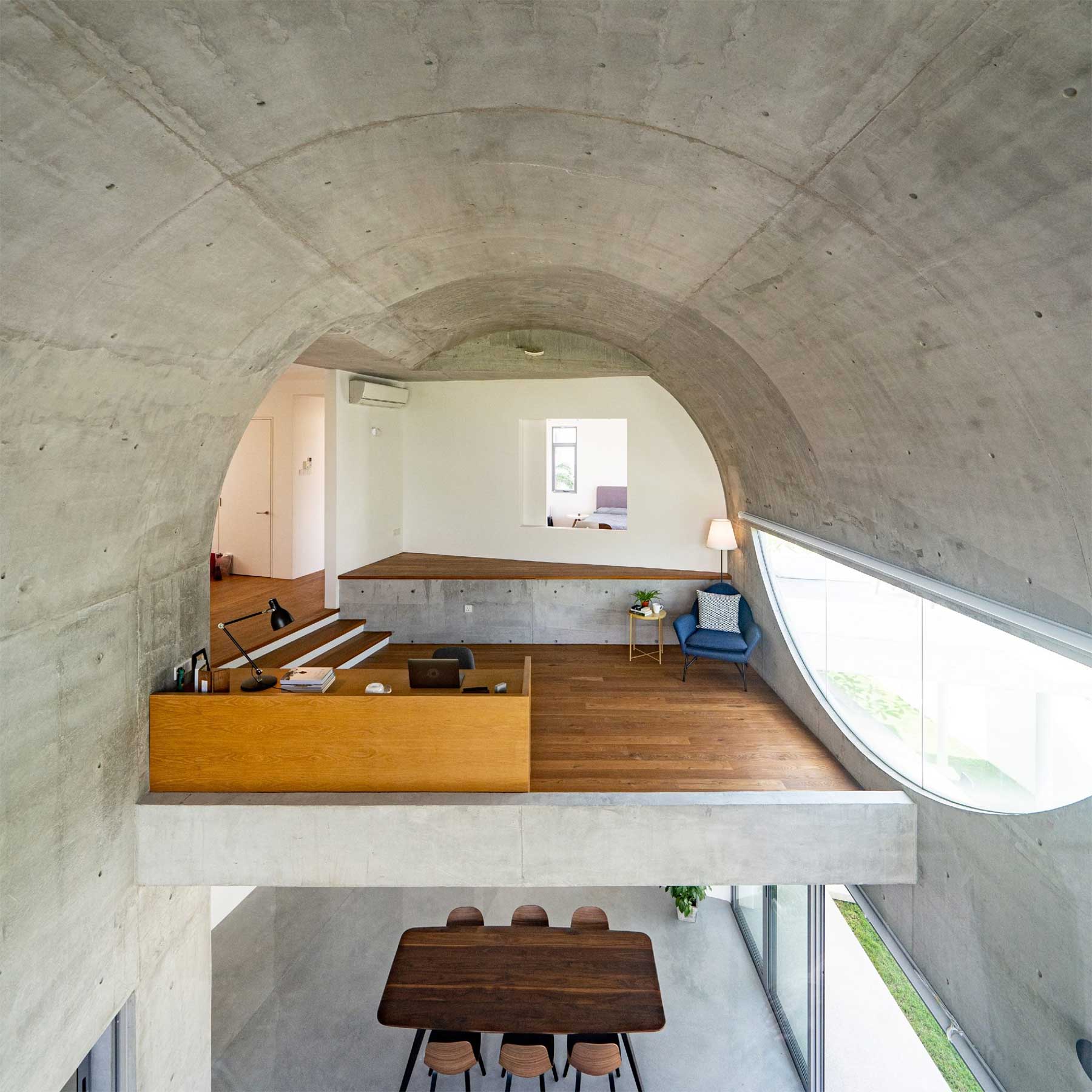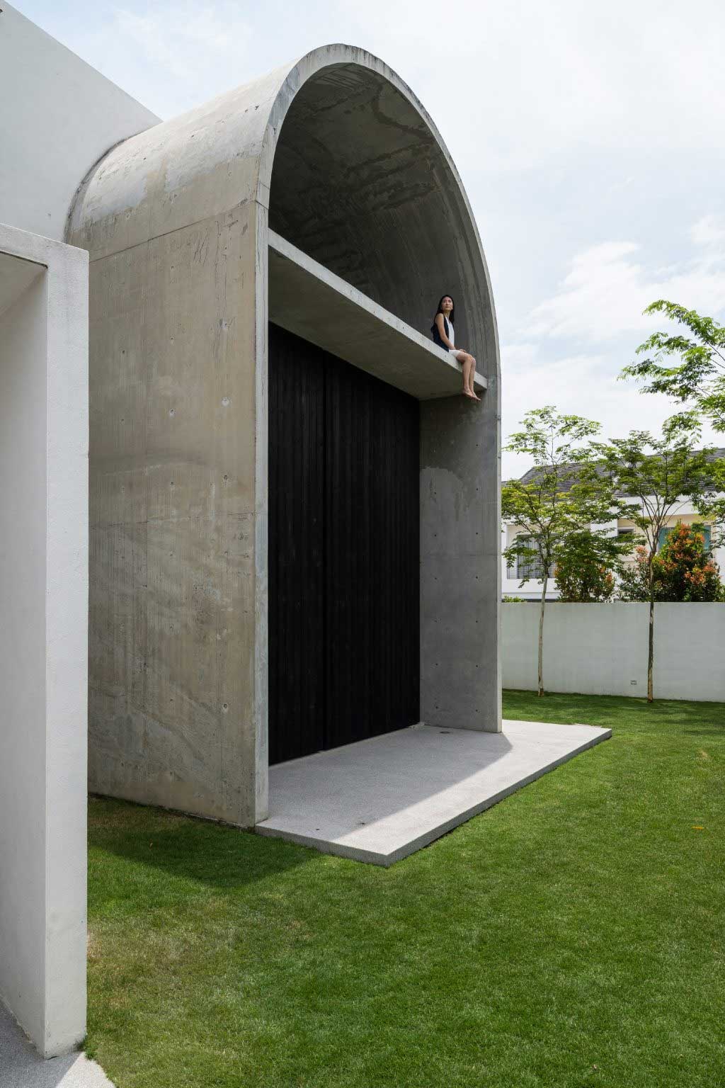 „The new form is intended to be simple but bold; contrasting it with the existing fabric of tropical suburban homes. From plan view, the living spaces were orientated parallel to the site boundary, resulting in a ‚break‘ between the original and new spaces. The triangulated ‚break‘ acts as a secured ventilated light well, cooling both sides naturally. An arch roof extends outwards, creating a vaulted annex that forms the living spaces. The space appears continuous through the extension of the arch and exaggerated further through the materiality of the concrete finish from floor to ceiling. The extension is further enhanced by two large doors that opens up to the garden. The uninterrupted perspective from inside out immediately connects the interior with nature.“