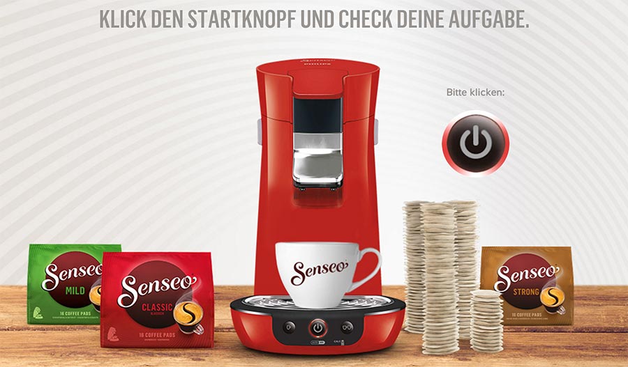 Unter Be-Senseo.de kann jeder mitmachen und gewinnen. Einfach den Startknopf der virtuellen Kaffeemaschine drücken und deine ganz persönliche Aufgabe erhalten. Nimmst du sie an? Dann hast du die Chance auf einen Reisegutschein in Höhe von 2.500 Euro und auf eines von zwei wöchentlichen Gewinnpaketen, die voller Senseo-Überraschungen sind. Worauf wartest du noch? Folge Deinem Gefühl!
