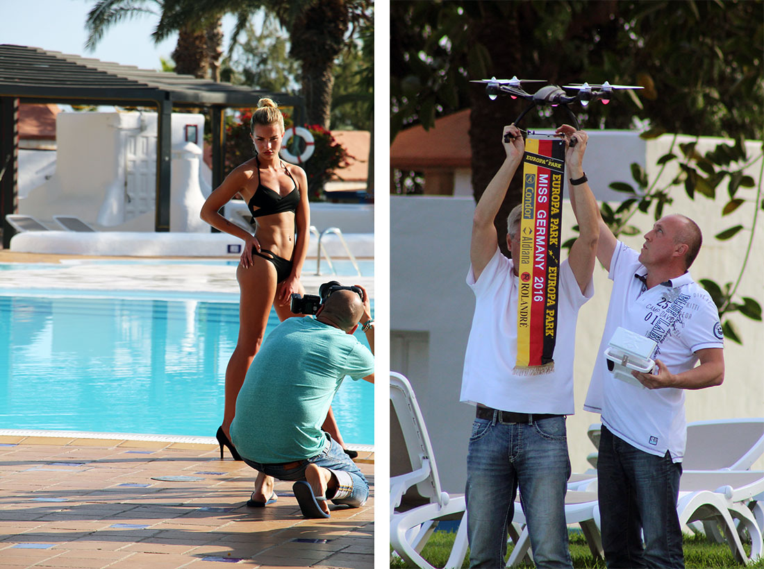 Dann kam endlich die Aufnahme, auf die alle gewartet hatten. An der Drohne wurde die Miss Germany 2016-Schärpe befestigt, die alle 24 Finalistinnen natürlich liebend gerne hätten. Ein Löffel sorgte dafür, dass die Schärpe nicht beim erstbesten Luftstoß in die Rotorblätter saust und findige „Landungshelfer“ haben das gute (=teure) Stück aufgefangen, da es so nicht mehr richtig landen konnte. Aufregung pur.