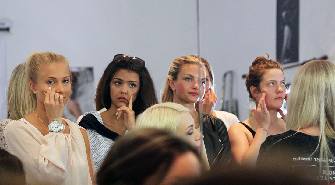 Am nächsten Morgen kam ein Termin, der Langeweile und Verwunderung in mir ausgelöst hat: der Schmink-Workshop. Die Missen kamen alle ungeschminkt und sollten sich mit ihren eigenen Produkten schminken – unter Beratung und Hilfeleistung der Profis. Die haben dann Tipps raus gehauen wie die Tatsache, dass die Augenbraue zu zwei Dritteln aufsteigt und ein Drittel sinkt (Scheitel mit Stift von der Nasenseite durch die Pupille findbar!). Auch wurden die Missen darüber aufgeklärt, wo sich der Wangenknochen befindet, was natürlich direkt mal physisch auf die Probe gestellt wurde…