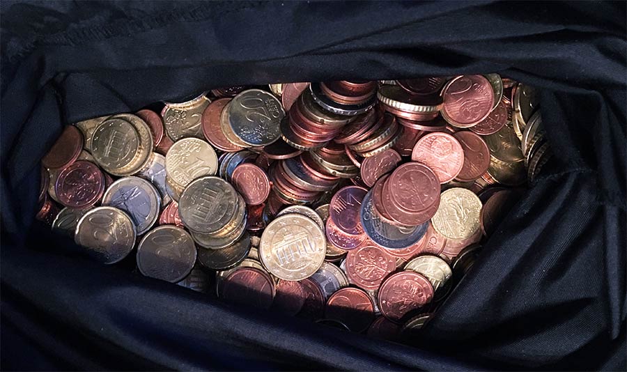 Dieses Jahr habe ich gefühlt recht wenig bar bezahlt. Daher auch wenig Wechselgeld erhalten und Münzen in die Spardose (also das Regalbrett im Arbeitszimmer…) legen können. Das ist wohlgemerkt gefühlt, denn ich schreibe diese Zahlen, bevor ich das Geld in der Bank einzahle. Unterstützt wird mein Gefühl jedoch darin, dass das Gewicht des etwa faustgroß gefüllten Umhänge-Taschen-Sportbeutel-Sacks nicht ausreicht, um die Waage zu aktivieren. Anscheinend beginnt diese bei zwei Kilogramm. Für die Küchenwaage, die nur bis 1kg geht, ist das Umhänge-Taschen-Sportbeutel-Säckchen zu schwer. Also habe ich mich selbst auf die Waage gestellt – ein Mal ohne und ein Mal mit Umhänge-Taschen-Sportbeutel-Sack. Ergebnis der komplexen Subtraktions-Arbeit: 1,7 Kilogramm.