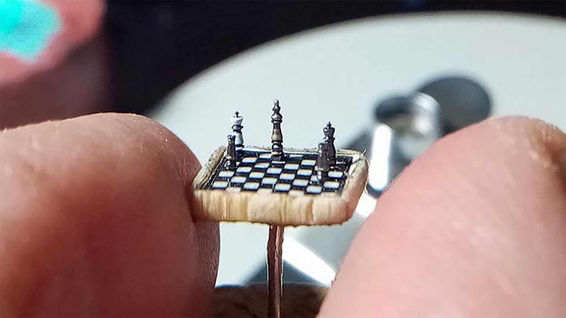9 Millimeter Länge und Breite misst dieses rekordverdächtige Miniatur-Stück, das der türkische Skulpteur Necati Korkmaz geschaffen hat. Die einzelnen Figuren sind gerademal anderthalb bis drei Millimeter „groß“ und so kaum zu bewegen. Selbst mit kleinem Kontaktstab und bei „aufgeräumten“ Spielfeld hat Korkmaz so seine Probleme, einen vernünftigen Zug zu schaffen. Die Formen von Läufer, Bauern und Co. kann man aber dennoch gut erkennen. Okay, zumindest unter dem Mikroskop oder mit der Lupe, bei bloßem Auge hätte ich wohl doch so meine Schwierigkeiten…