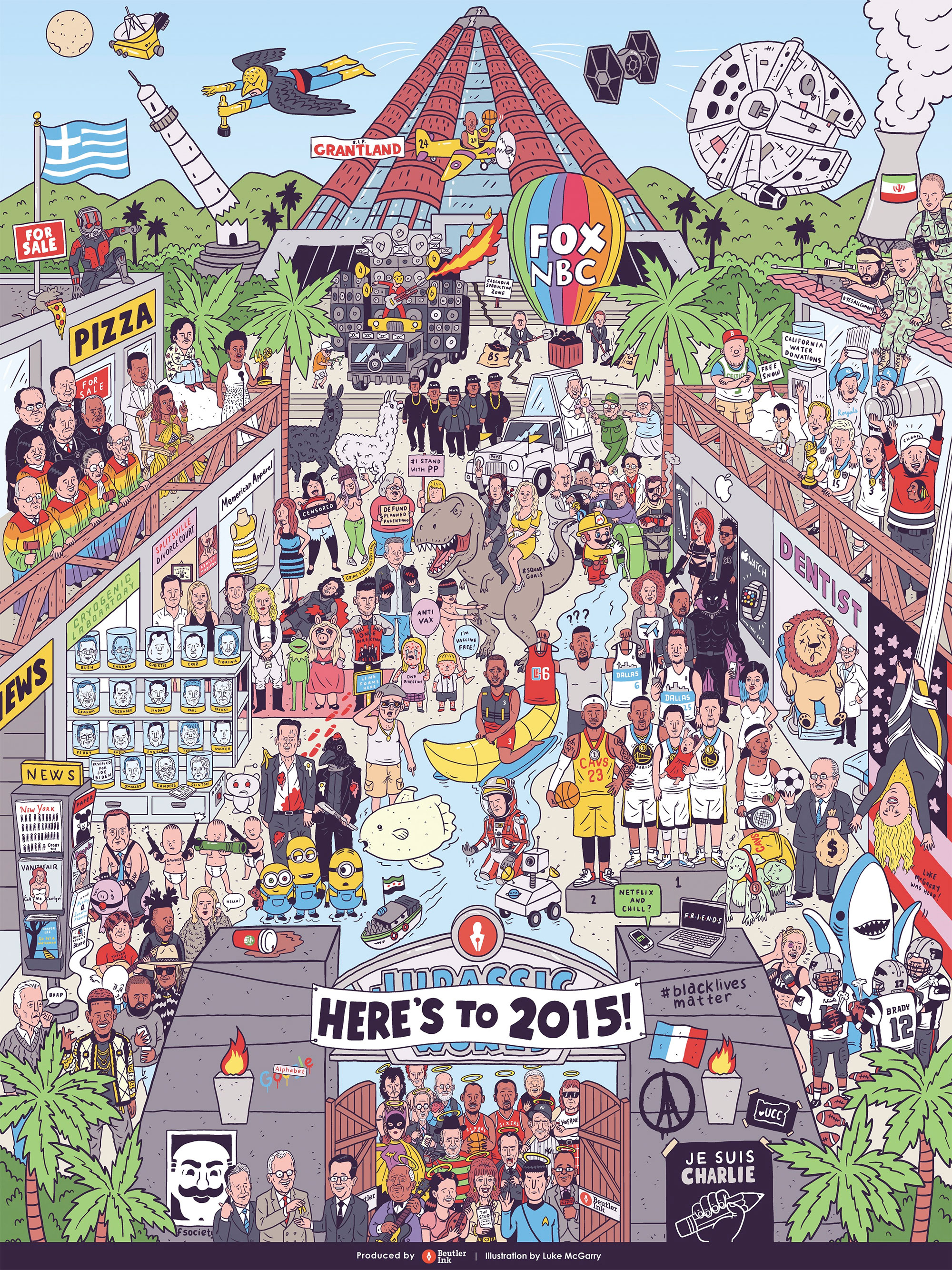 „Face front, true believers! Beutler Ink has once again gathered the biggest stories of the past year—from soaring triumphs (Pluto flyby) to sobering tragedies (Paris attacks) to stomach-turning travesties (Go Set a Watchman)—and packaged them together into a single, sprawling illustration.“