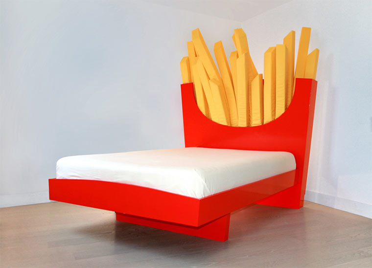 Gemeinsam mit Harry Parr hat die britische Set- und Kostümdesignerin Cecilia Carey ein Bett im Pommes-Look entwickelt. Im ikonischen Verpackungsdesign einer großen Fast Food-Kette wurden die funktionalen Pommes, die als Kissenelemente entnommen werden können, am Bettkopf angebracht. Kreatives Design für jeden Fast Food-Junkie und sicherlich ein ideales Geburtstagskind für jeden Achtjährigen.