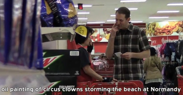 Greg Benson und Ryan Smith haben sich gegenseitig Einkaufslisten geschrieben. Soweit so unspekatulär. Aber sie wissen jeweils nicht, welche Gegenstände auf der Liste stehen. Immer noch nicht toll? Was aber, wenn ich euch sage, dass sie sämtliche Artikel bei den Supermarktmitarbeitern nachfragen müssen? Interessiert? Völlig zurecht! Denn den Großteil der nachgefrakten Artikel gibt es gar nicht, oder zumindest nicht in einem Supermarkt. Die gewinnbringende Spielregel ist auch schnell erklärt: Der, dessen Supermarktmitarbeiter als erstes das Weite sucht, hat verloren. Großartiges Spiel, definitiv zur Nachahmung empfohlen!