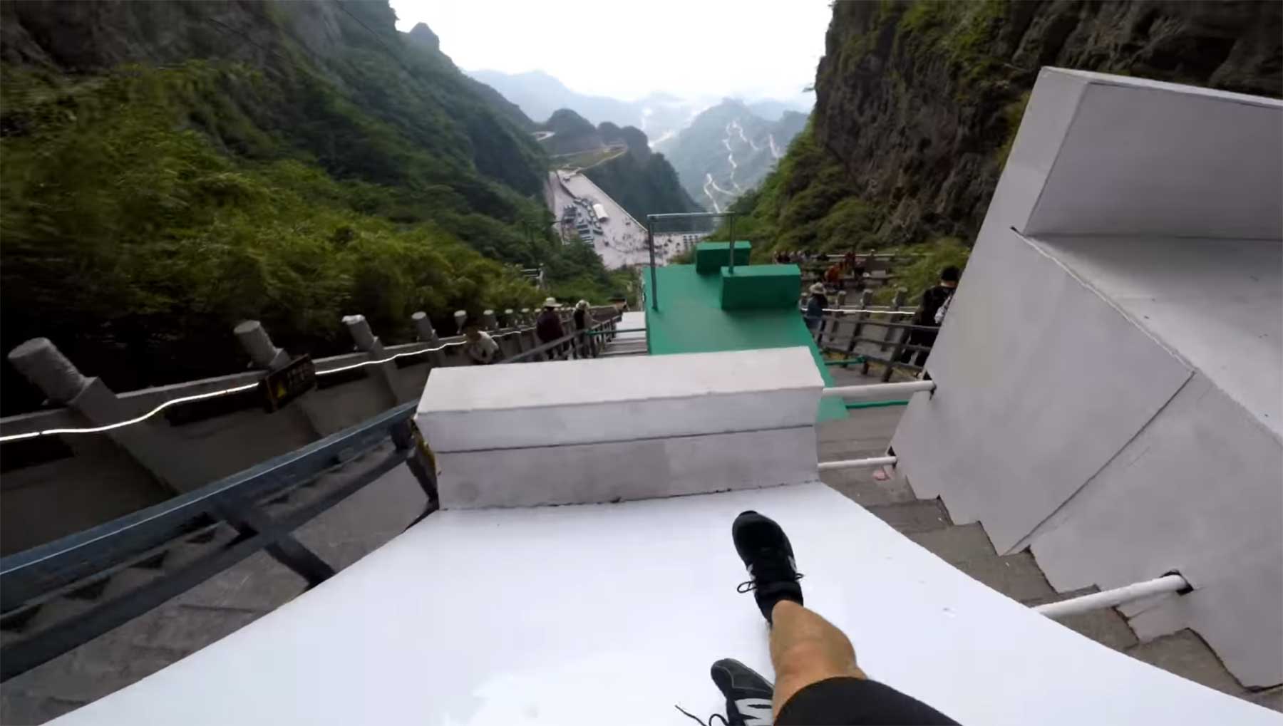 Freerunner Calen Chan hat kürzlich beim „Skyladder Parkour“-Wettbewerb am chinesischen Tianman Mountain teilgenommen. 999 Stufen ging es beim mit 45 Grad Steigung an eine Skisprungschanze erinnernde Location namens „Heaven’s Gate“ hinab. Aber natürlich nicht einfach so, sondern möglichst flüssig und in Style. Das wirkt nochmals eine Nummer krasser, weil wir dank Kamera die Perspektive Chans beim Hinunterkrakseln einnehmen. Puh!